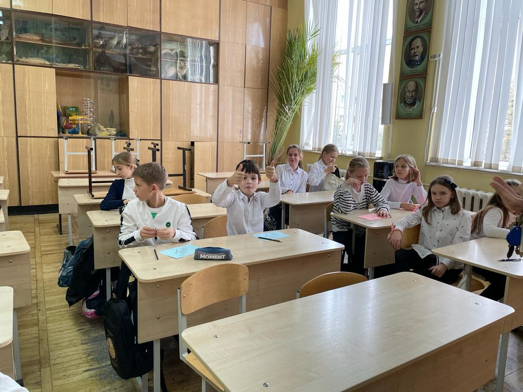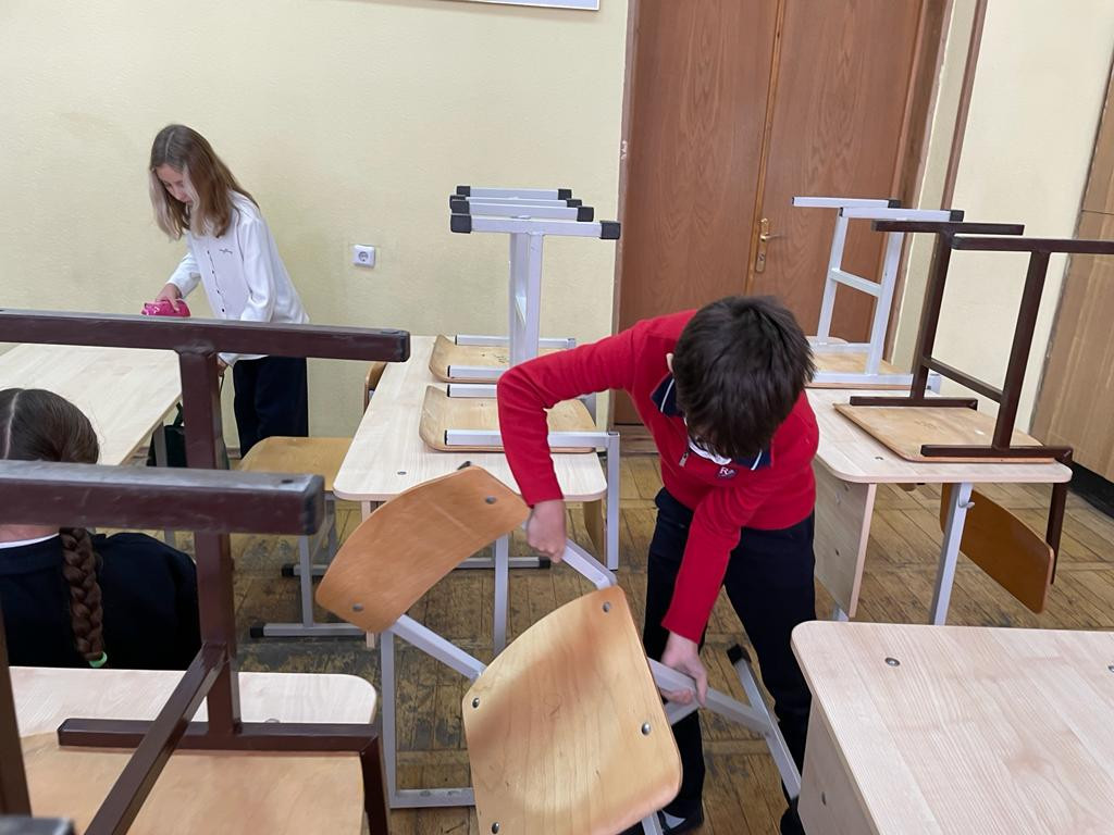 В 5 "Д" классе был проведен киноурок "Пять дней" (созидательный труд). Просмотрев фильм, ребята обсудили его содержание, заполнили таблицы "От потребителя к созидателю" и самостоятельно решили помочь сотруднице гимназии, следящей за чистотой помещений, и подняли в кабинете стулья, чтобы ей было легче убрать классную комнату.