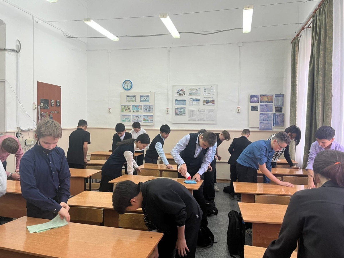 Учебный кабинет - это в первую очередь визитная карточка класса. Мы решили помочь техническому персоналу школы поддерживать чистоту кабинета: помыли парты и стулья, а также произвели влажную уборку всех поверхностей кабинета.