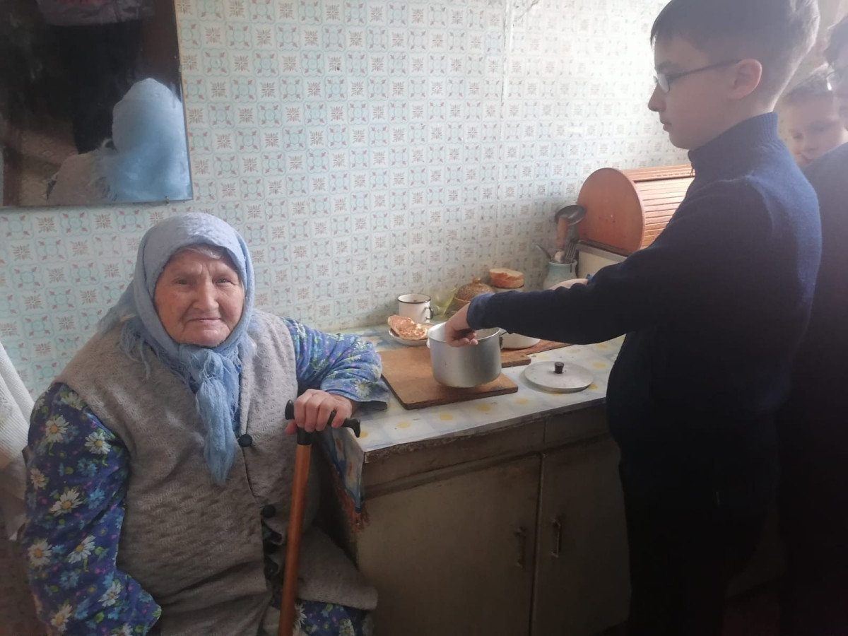После просмотра фильма"Пять дней", формируемое качество - созидательный труд, обучающиеся 5 класса решили помочь в уборке дома за закреплены за ними ветеранов. Ребята пришли с гостинцами и помогли бабушке убраться в квартире