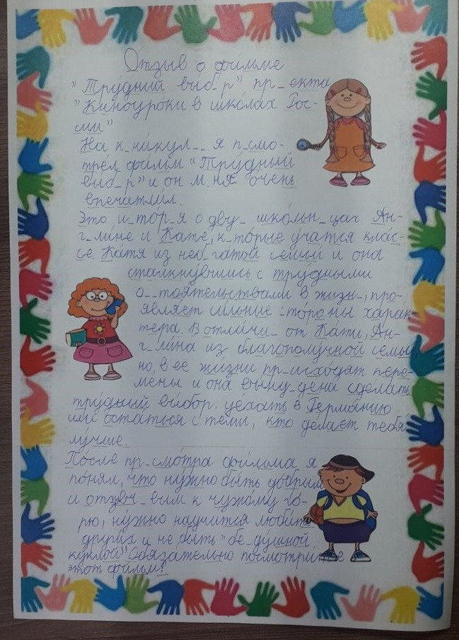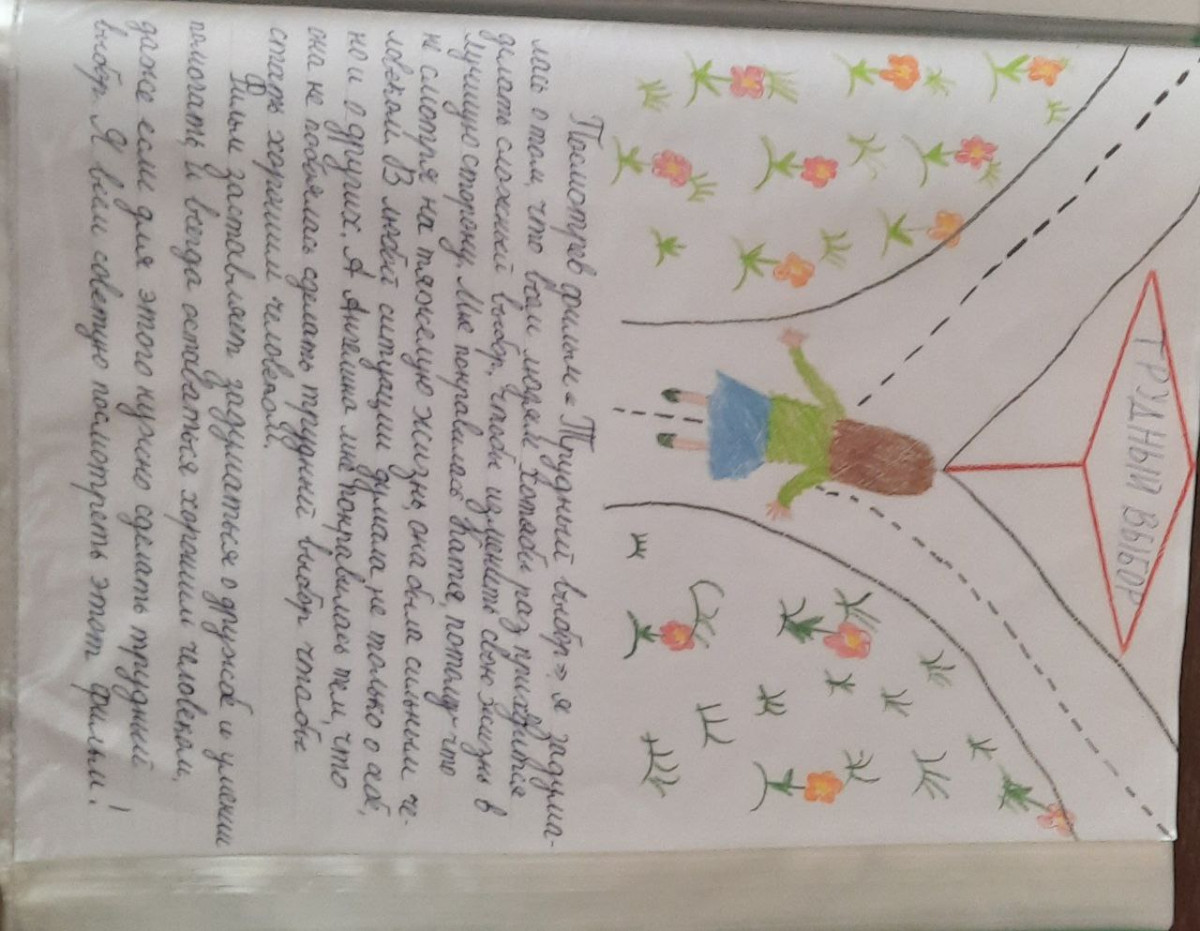 Обсуждая кинокартину, ребята говорили о душевной красоте человека, дружбе, выгоде, эгоизме, безразличии, равнодушии. Ученики выяснили что такое выбор и поняли, что в жизни человек очень часто делает выбор, трудный выбор.