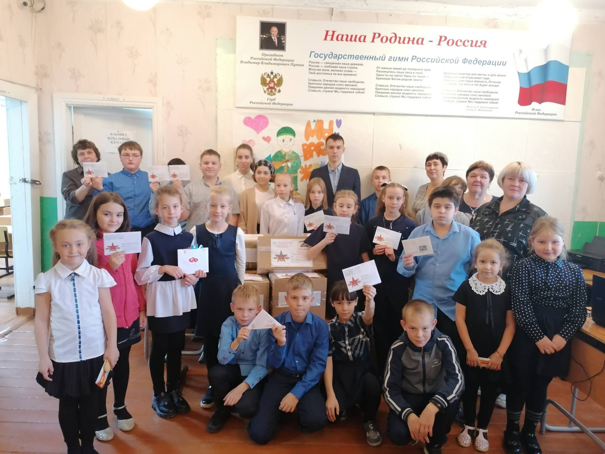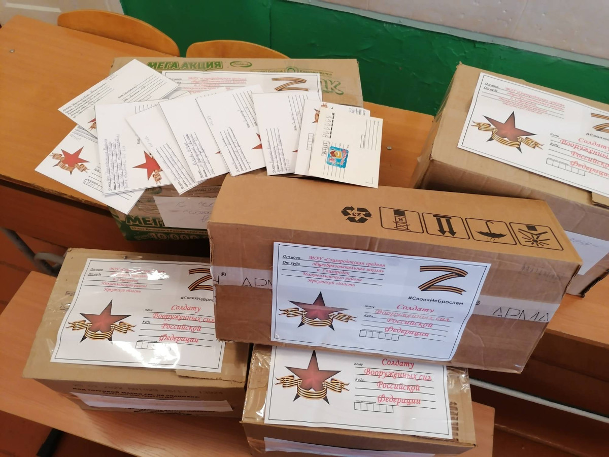 В школе собрали посылки и написали письма для мужчин, мобилизованных для участия в специальной военной операции на Украине. В сборе участвовали все сотрудники и ученики, родители.