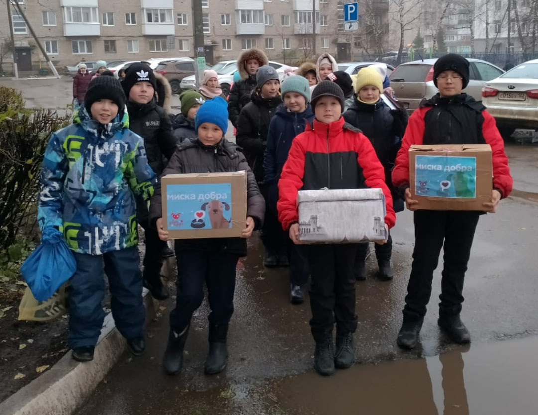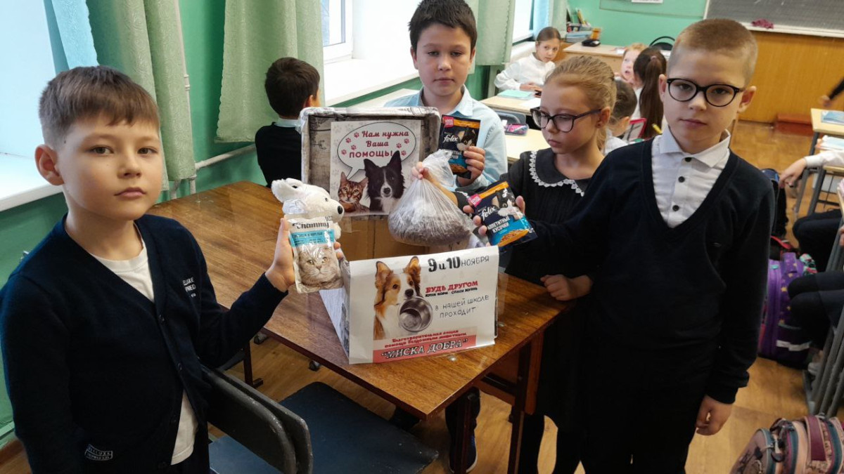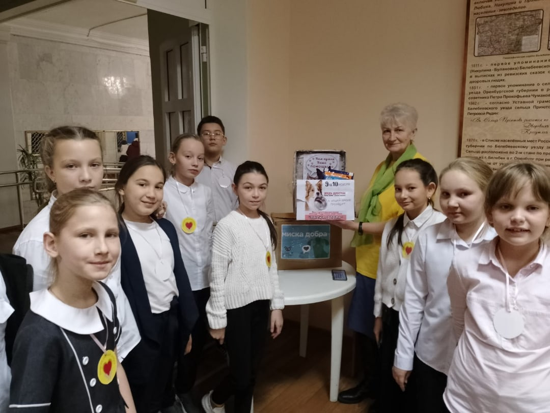 После просмотра и обсуждения фильма, ребята решили провести школьную акцию "Миска добра". Принесли и обклеили коробки, оформили зону, напечатали объявление. В течении трех дней учащиеся и учителя приносили корм для бездомных животных. Корм собрали для приюта бездомных животных и передали волонтерам.