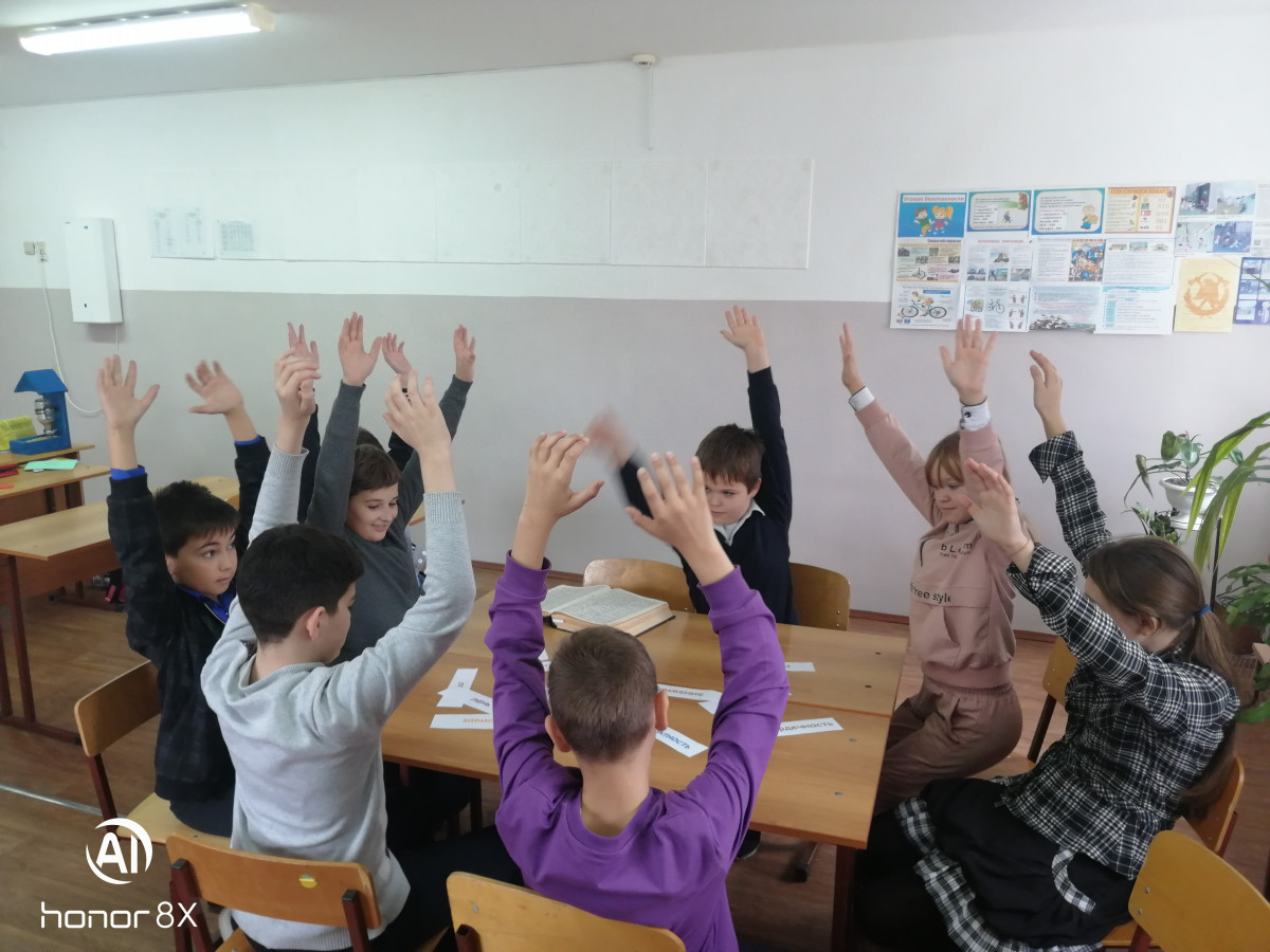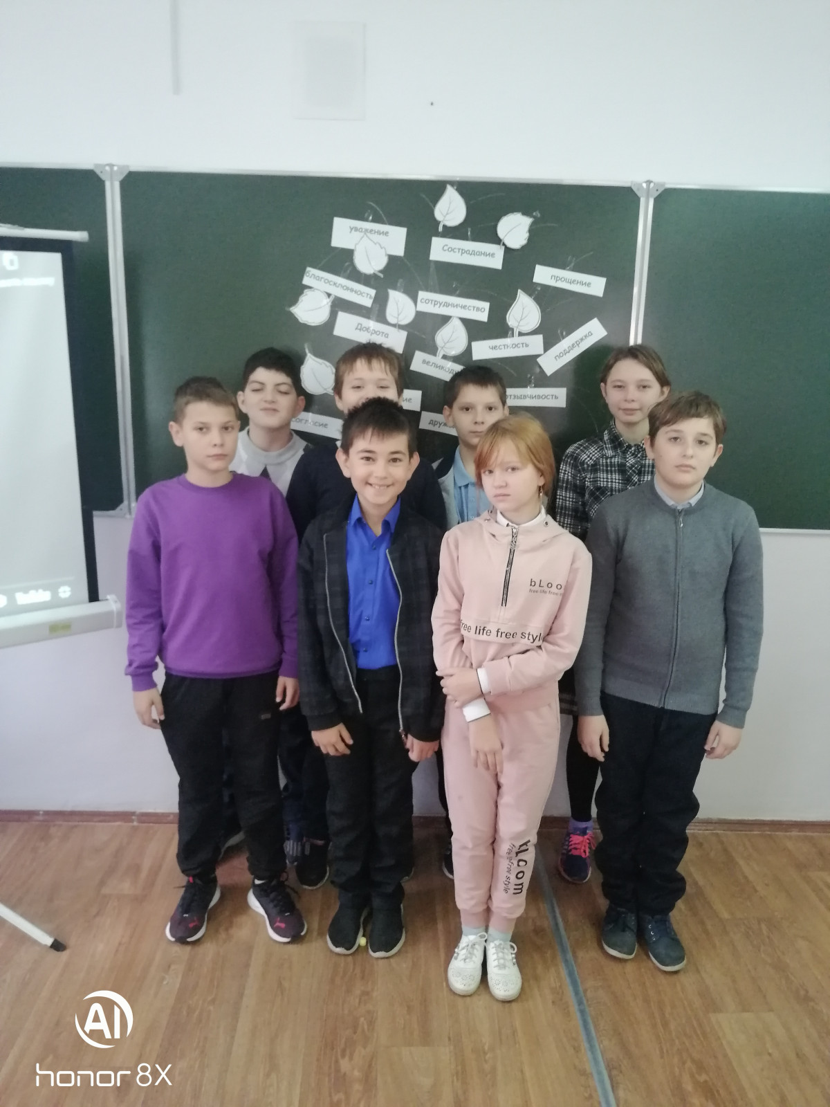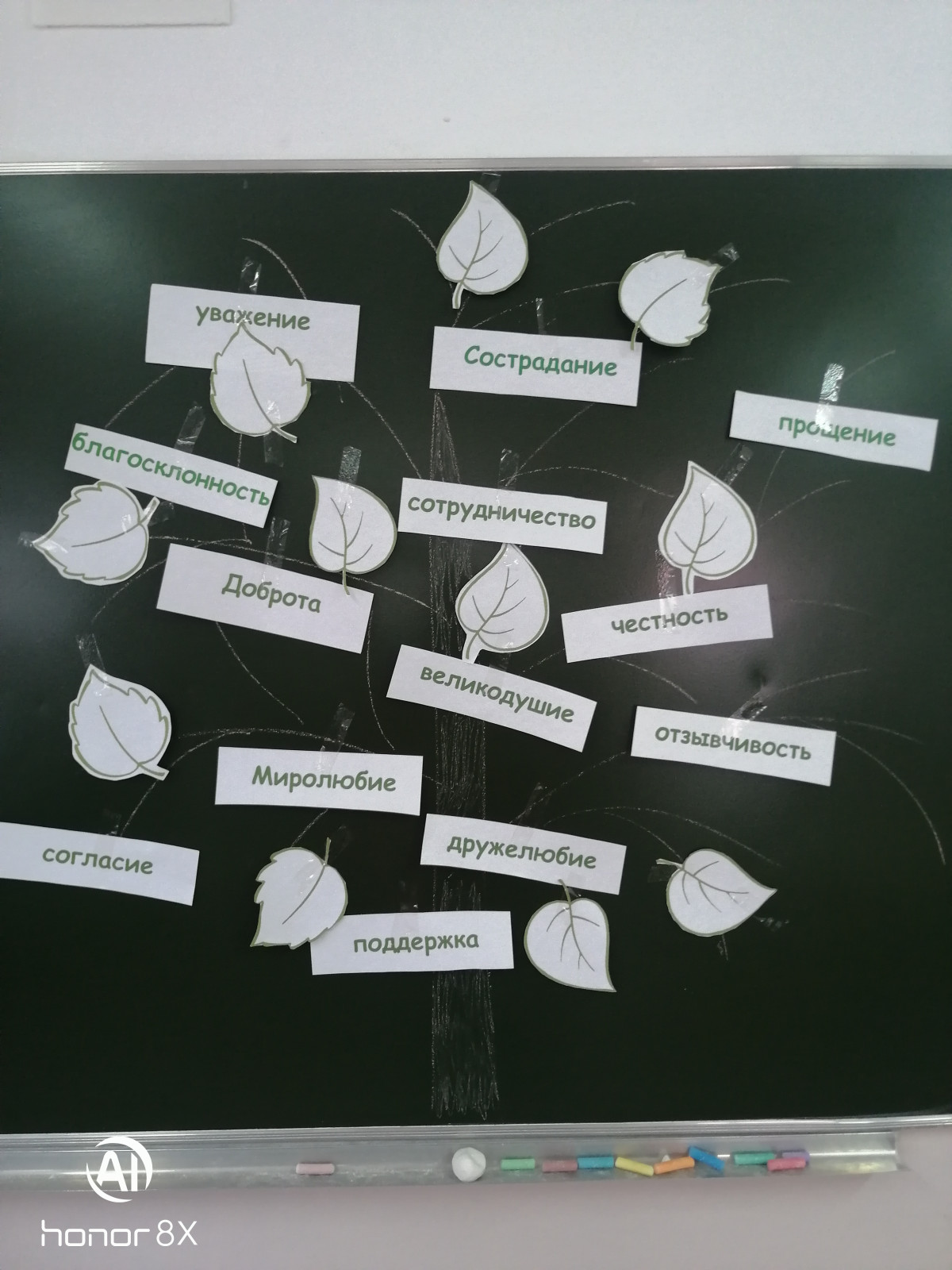 14 ноября был проведен киноурок. Так как дети ещё маленькие после просмотра фильма они сначала сами, затем при помощи толкового словаря дали определение , что такое справедливость. Далее учителем было предложено выбрать качества человека , которые соответствуют справедливости (в конверте находились и положительные и отрицательные качества). Задача детей была не только, в том чтобы указать то или иное качество, но и аргументировать свой выбор, потому что не всем качествам дети могли верно дать понятие. После правельного выбора дети брали листок и приклеивали его к дереву , которое заранее было нарисовано на доске. Таким образом, при каждом верном выборе на нашем дереве появлялось все больше и больше листьев.