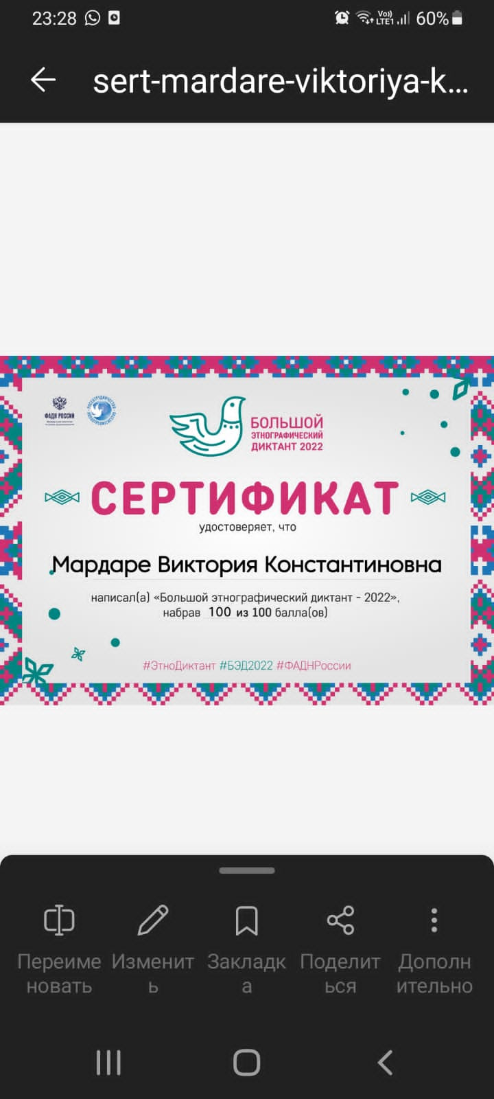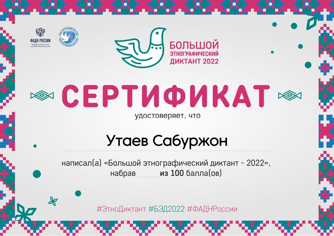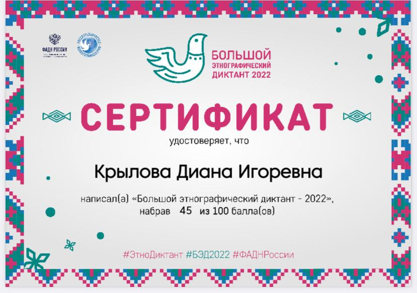 1. Приняли активное участие в международной просветительской акции "Большой этнографический диктант". Знание своей культуры способствует укреплению согласия,межэтнического мира и национального единства народов РФ.