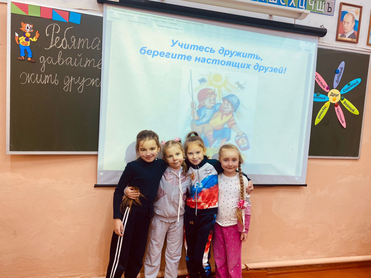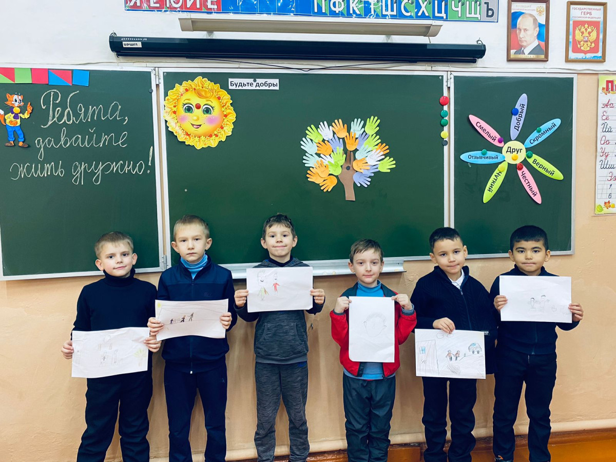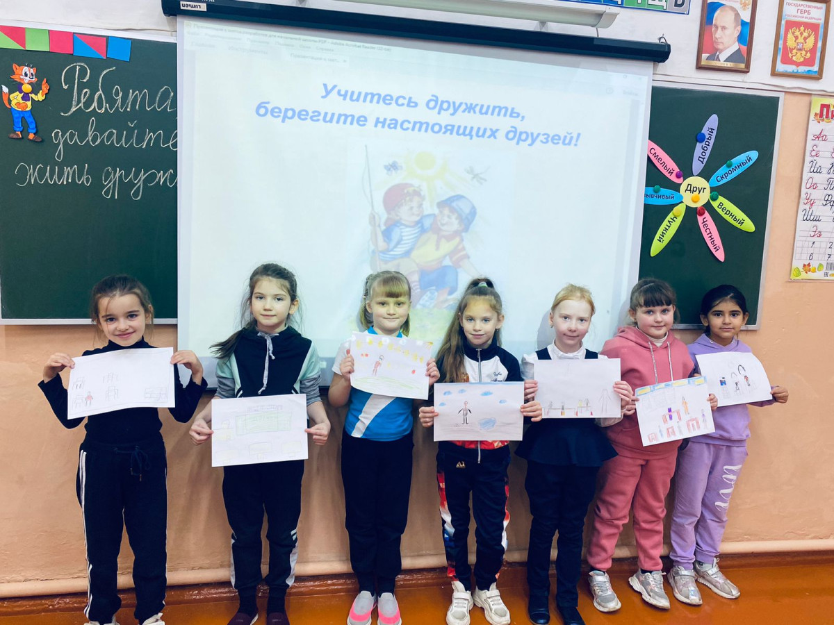 После обсуждения фильма учащиеся нарисовали иллюстрацию к фильму-эпизоду, который им понравился больше всего. Также в ходе урока дети отгадывали загадки на тему «дружба».Читали стихотворений о дружбе и пели песню о дружбе.