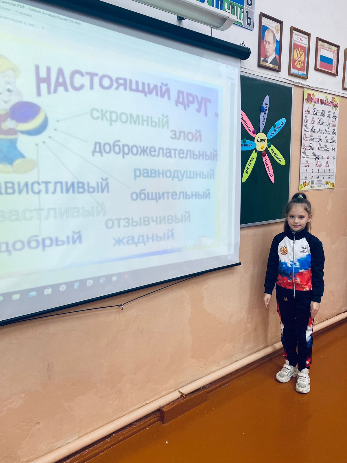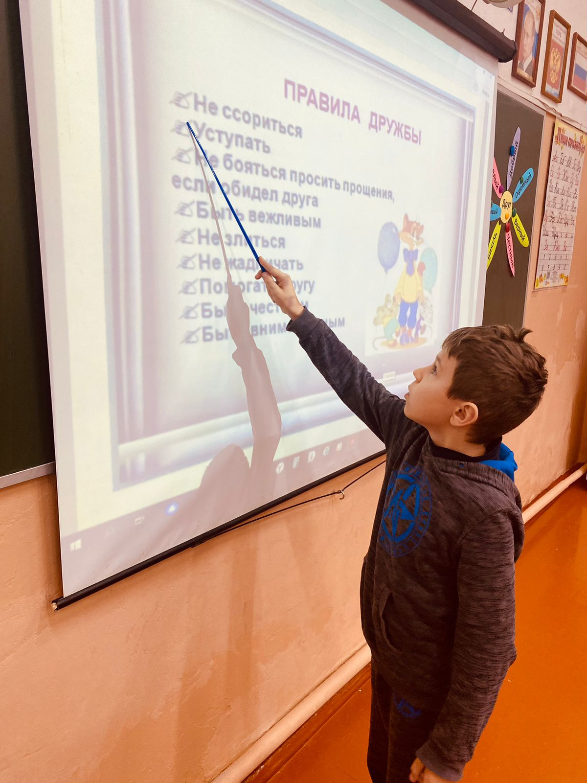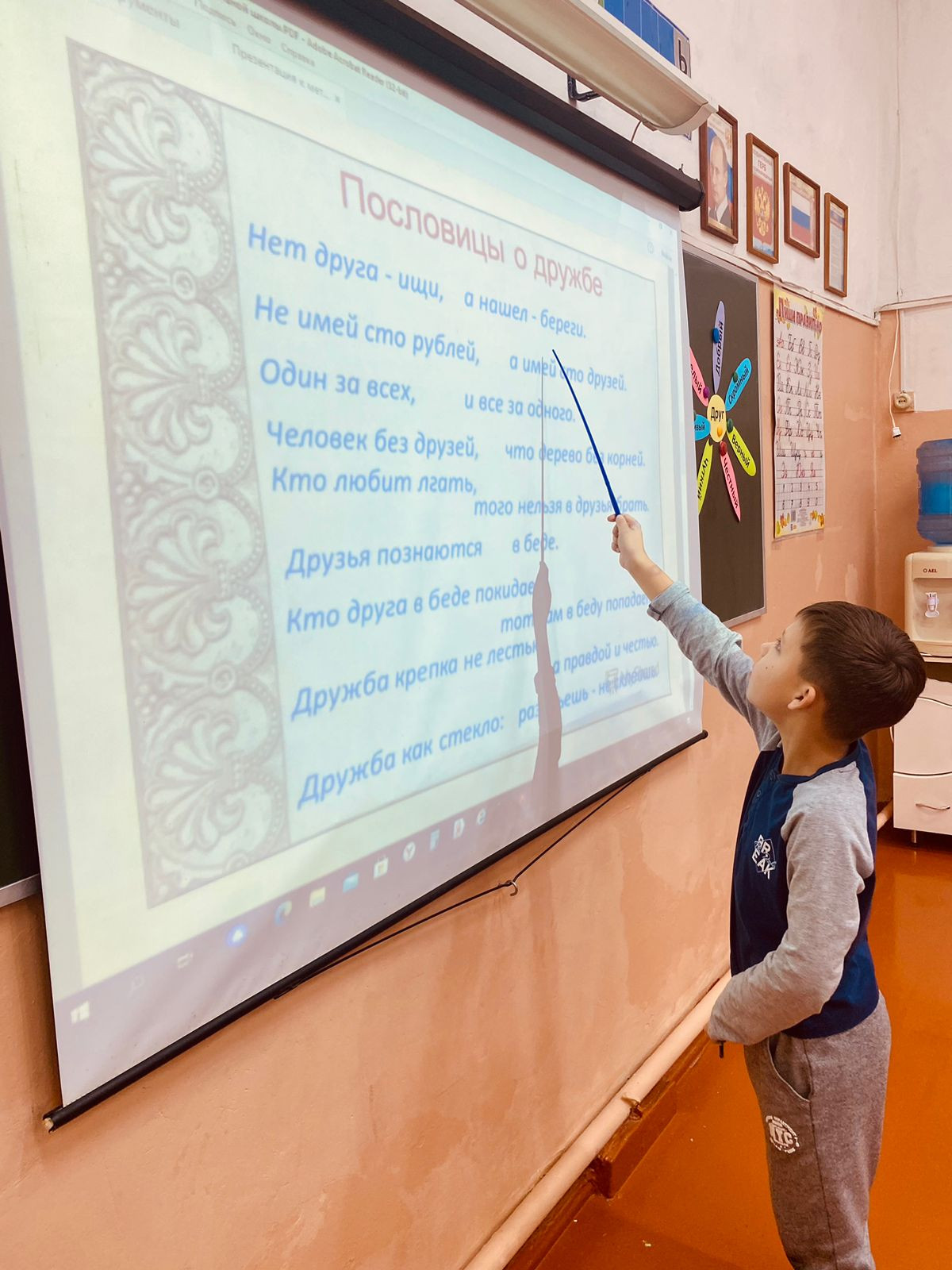 После обсуждения фильма учащиеся нарисовали иллюстрацию к фильму-эпизоду, который им понравился больше всего. Также в ходе урока дети отгадывали загадки на тему «дружба».Читали стихотворений о дружбе и пели песню о дружбе.