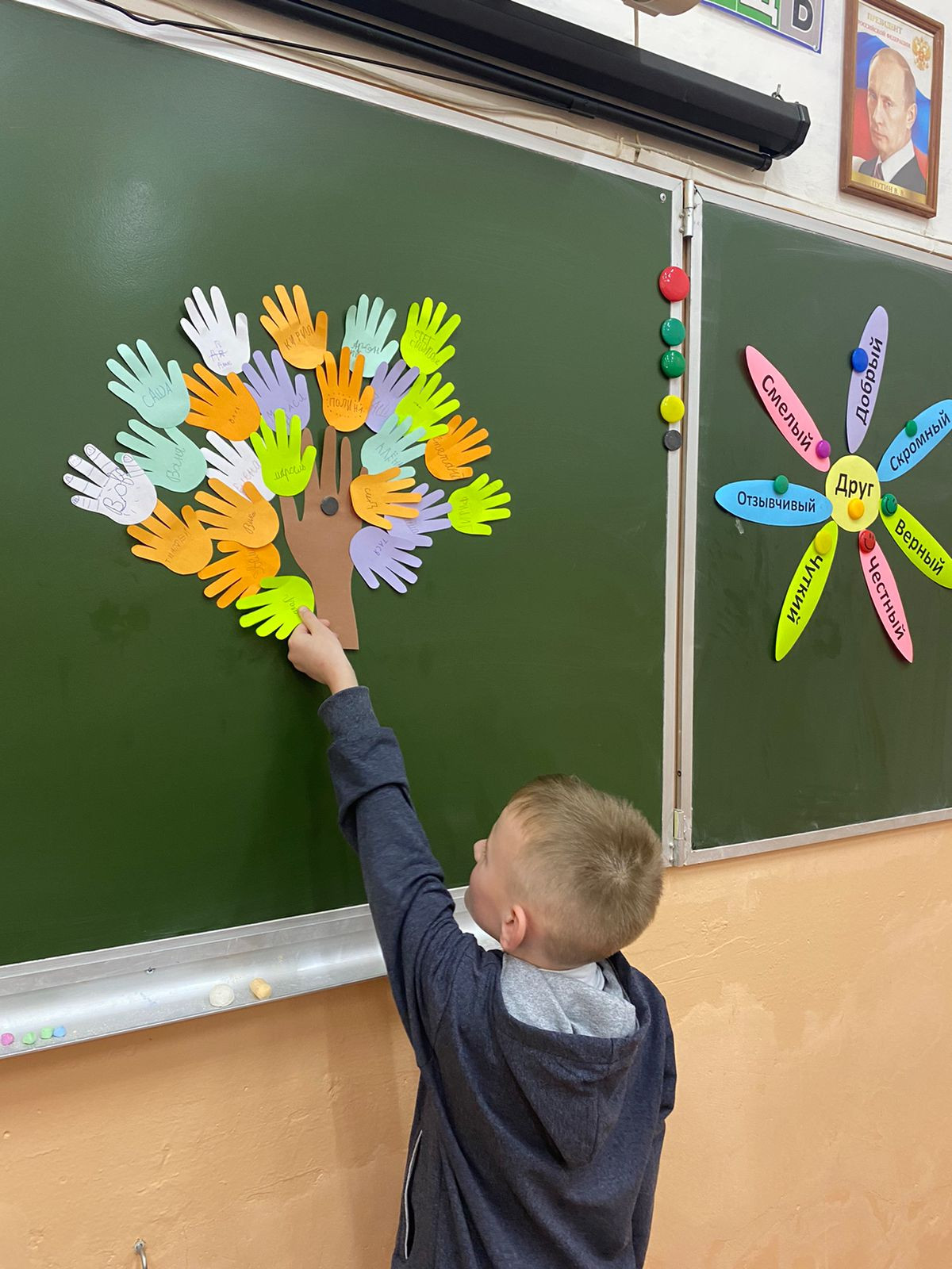 В конце занятия мы с ребятами сделали из разноцветных ладошек «Дерево дружбы». Наше дерево вышло крепким, могучим, как дружба ребят нашего класса.