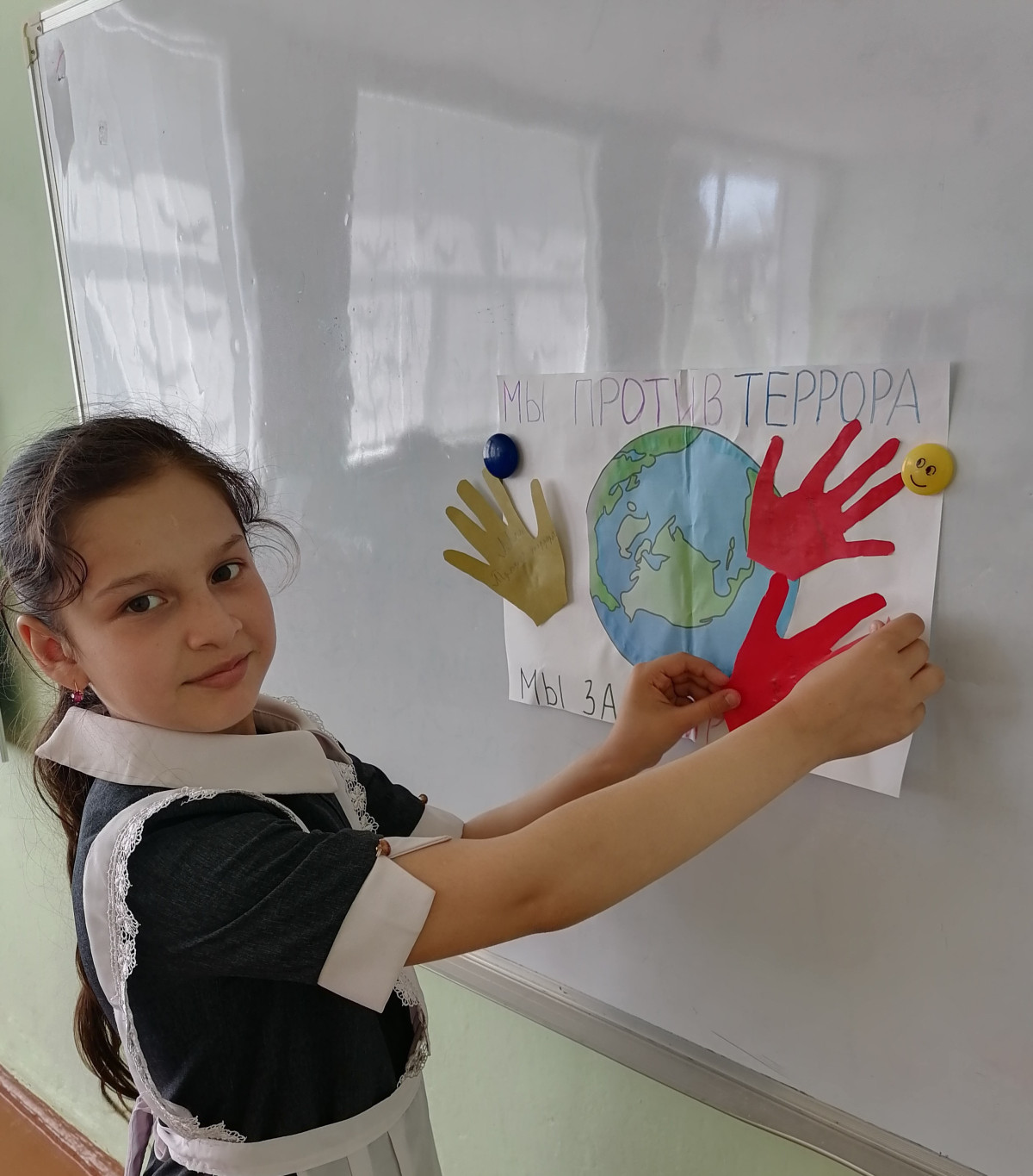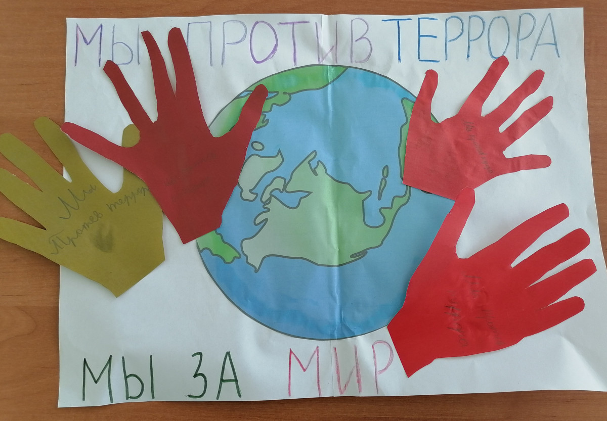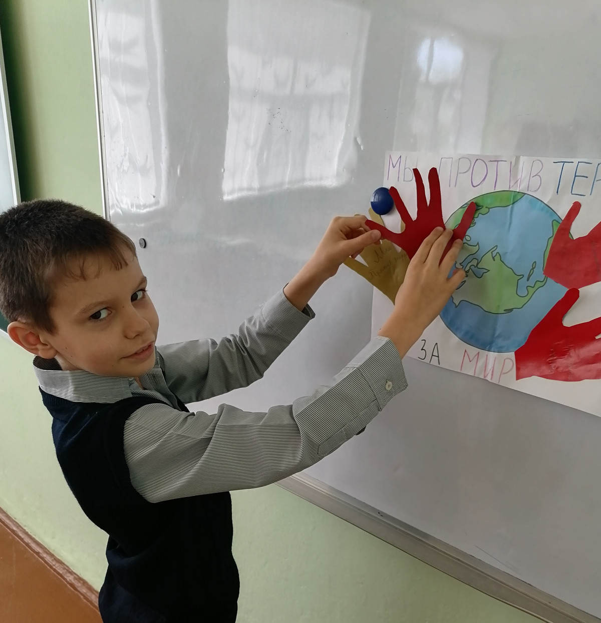 9 ноября в 4 классе был просмотрен фильм "Другой мир"- фильм о будущем, к которому может прийти каждый, если только будет к этому стремиться. Просмотрев его, ребята поделились своими впечатлениями, одни нарисовали понравившийся им сюжет из фильма, другие нарисовали свою фантазию. А после предложили создать свой плакат(портал) , на котором изобразили мир без террора.