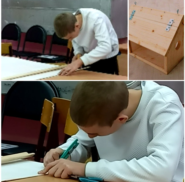 Ребята дружно взялись за дело: выбрали самый удачный чертеж, делали замеры, вырезали лобзиком. Хотели сделать кормушку как в усадьбе А.П.Чехова- с тремя отверстиями, но остановились на варианте более простом.