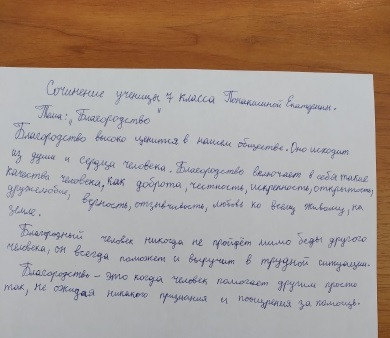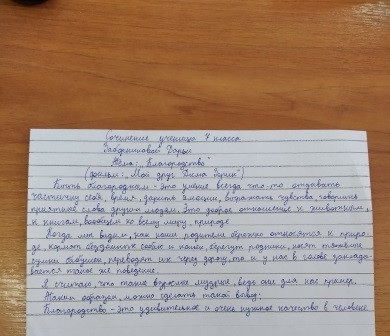 После просмотра фильма ''Мой друг Дима Зорин'' дети захотели написать сочинение на тему ''Благородство''.И прочитали свое сочинение в начальных классах. Ученица 7 класса Катя Понакшина нарисовала картину о защите природы, посчитав ,что защита природы- это благородное дело. И разместила картину в сельской библиотеке. Акимов Назар помогал взрослым , пожилым при переходе через дорогу,помогал донести тяжелые сумки. При подведении итогов, было очень приятно услышать слова, выводы учеников; ''Фильм поставил перед нами несколько вопросов;благородство в нашей жизни, отношение к больным людям.Мы получили богатую пищу для размышлений.