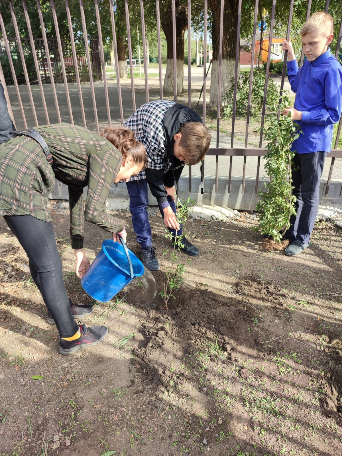 После просмотра фильма "Пять дней" учащиеся 6 "А" обсудили такие понятия как ответственность и созидательный труд. Ребята очень воодушевились поведением главного героя фильма Максима, который участвует в жизни города и помогает людям. Ученики предложили облагородить территорию школьного двора и посадить деревья. Администрация школы и родители поддержали задумку и приобрели саженцы. Под руководством классного руководителя дети посадили деревья и ухаживают за ними
