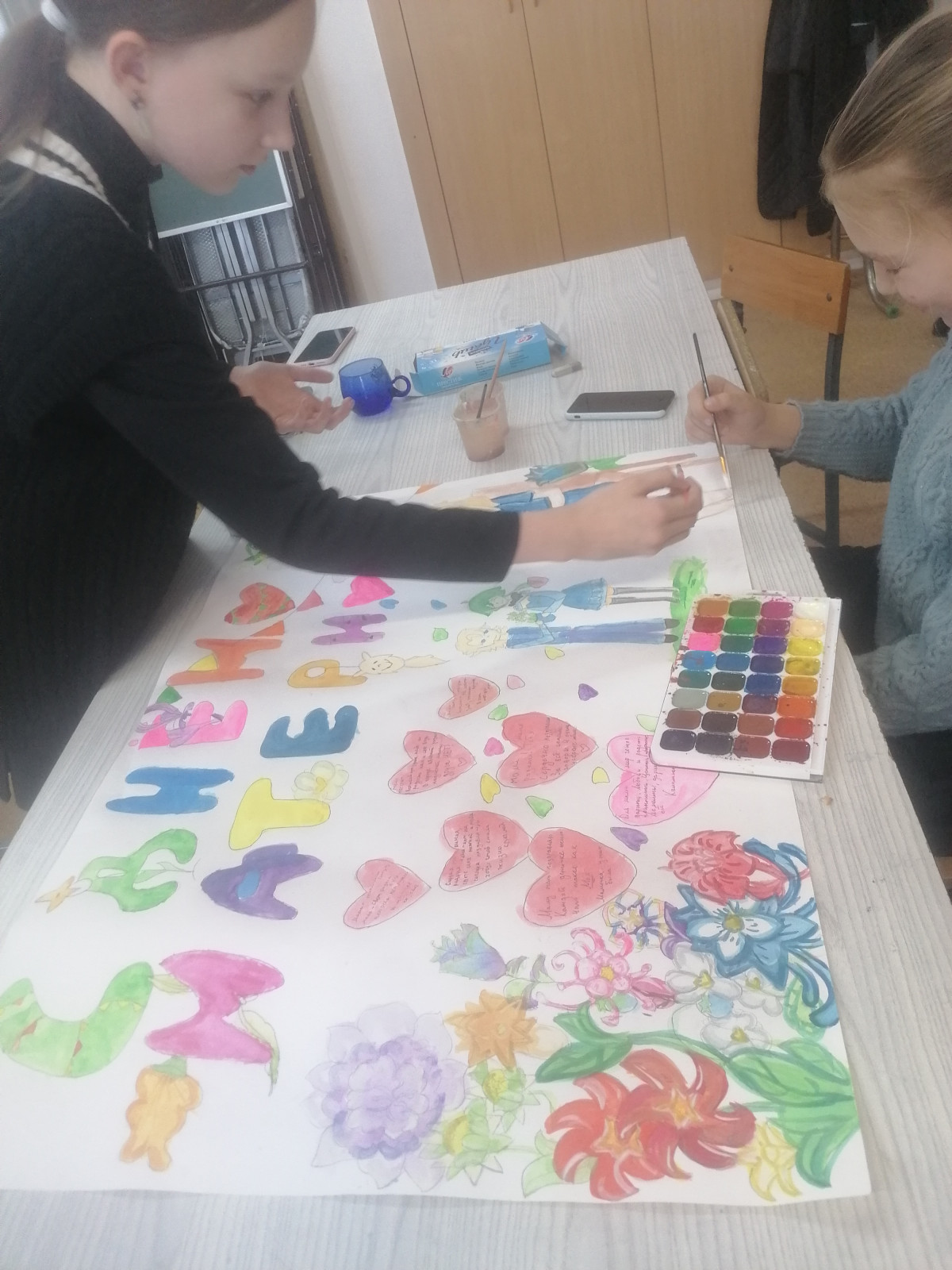 К приближающемуся Дню Матери обучающиеся 5 В класса предложили нарисовать стенгазету и приготовить памятные подарочки для мам. Дети самостоятельно купили конфеты и оформили коробочки с сюрпризом. Мамы приглашены на концерт с участием детей, где и будут им вручены подарки. Мамы будут очень рады.
