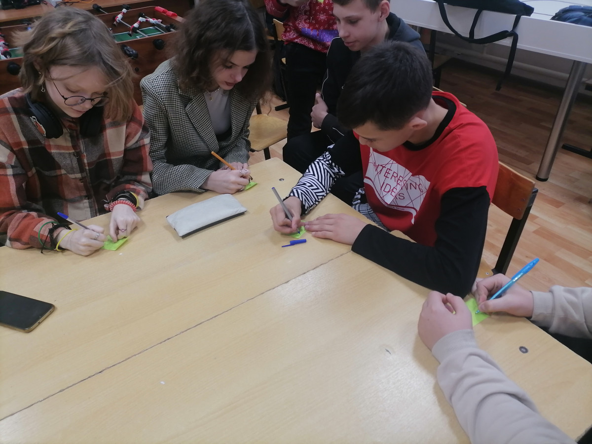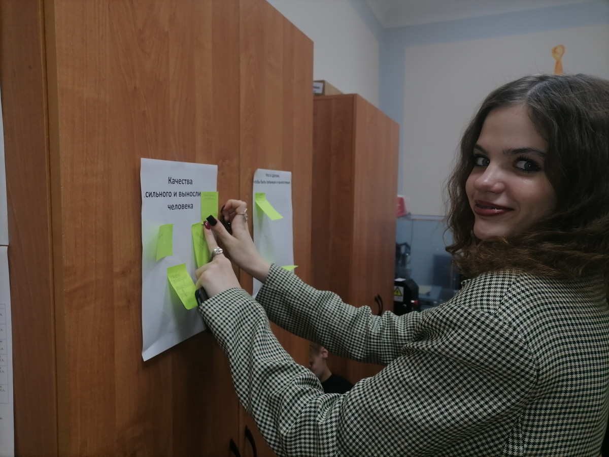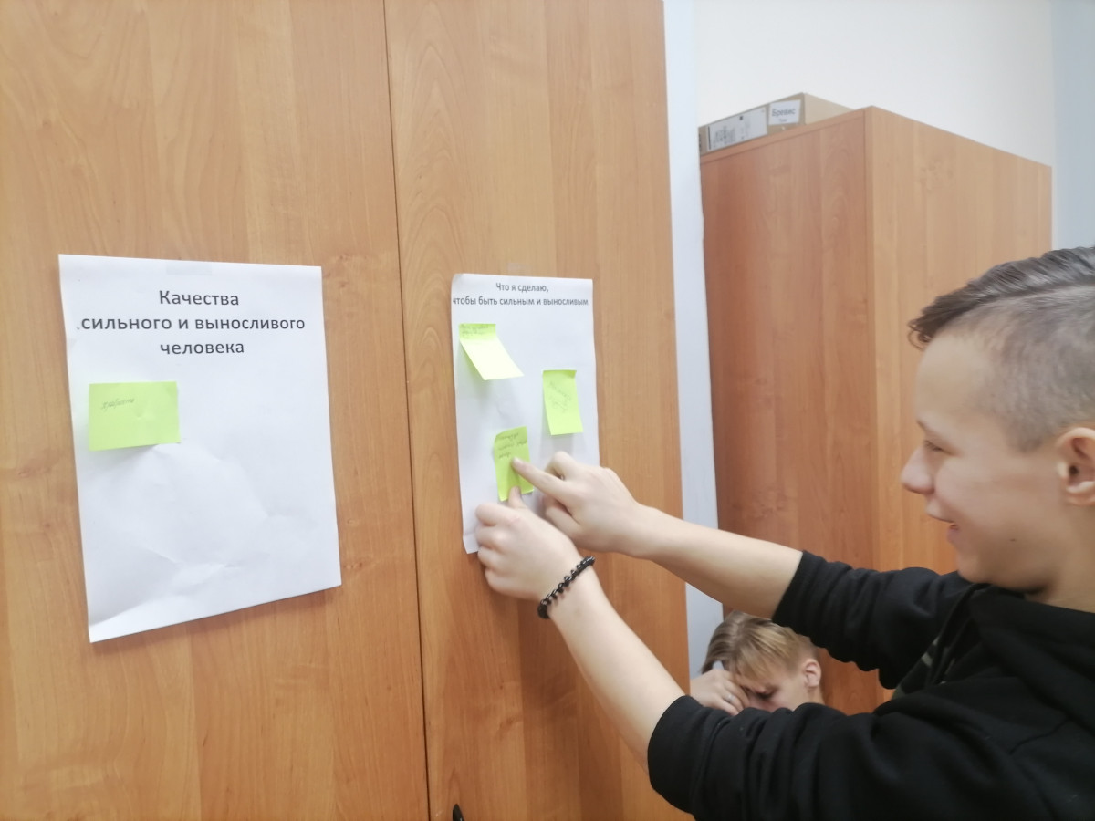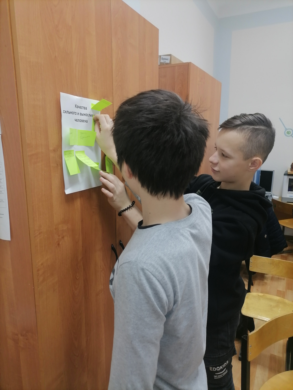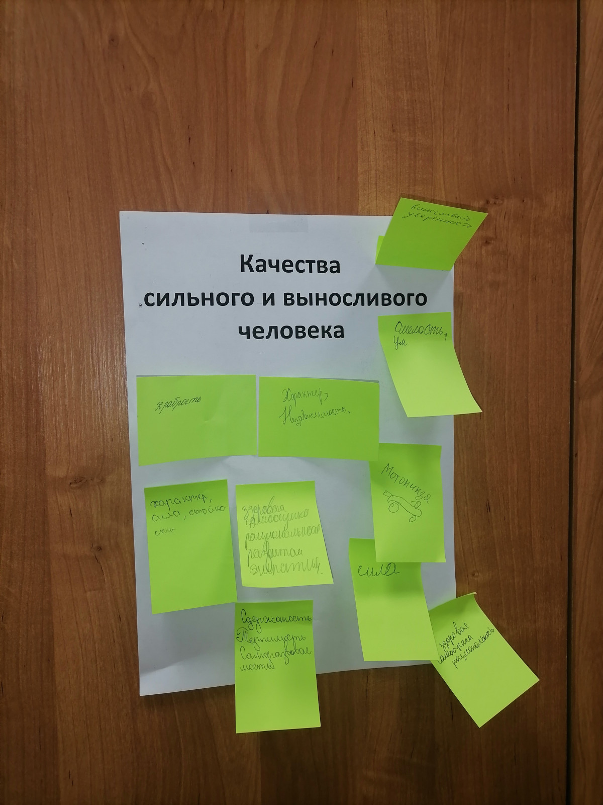 После просмотра фильма Мост была проведена дискуссия на тему: Какими качествами обладает сильный и выносливый человек. Мнений оказалось очень много. Так была создана идея сделать небольшой баннер. Ребята писали свое мнение о качествах сильного и выносливого человека на стикерах и клеили их на банер. Также это было предложено и другим обучающимся школы.