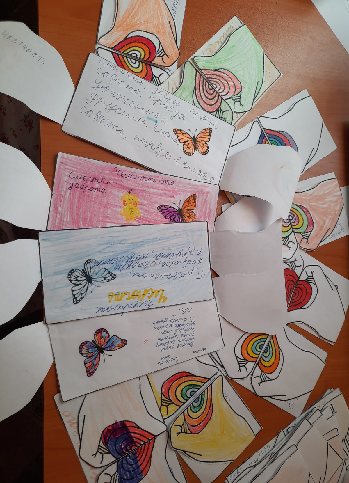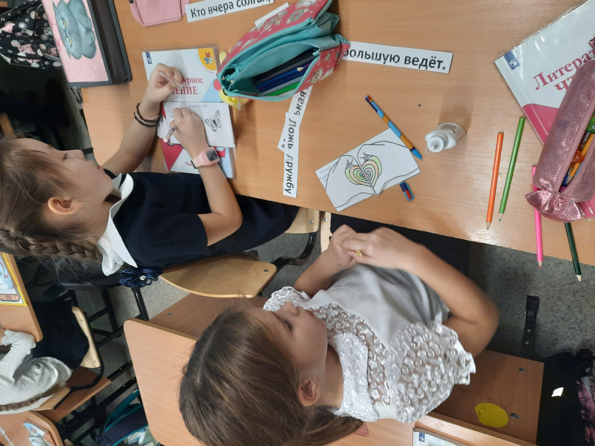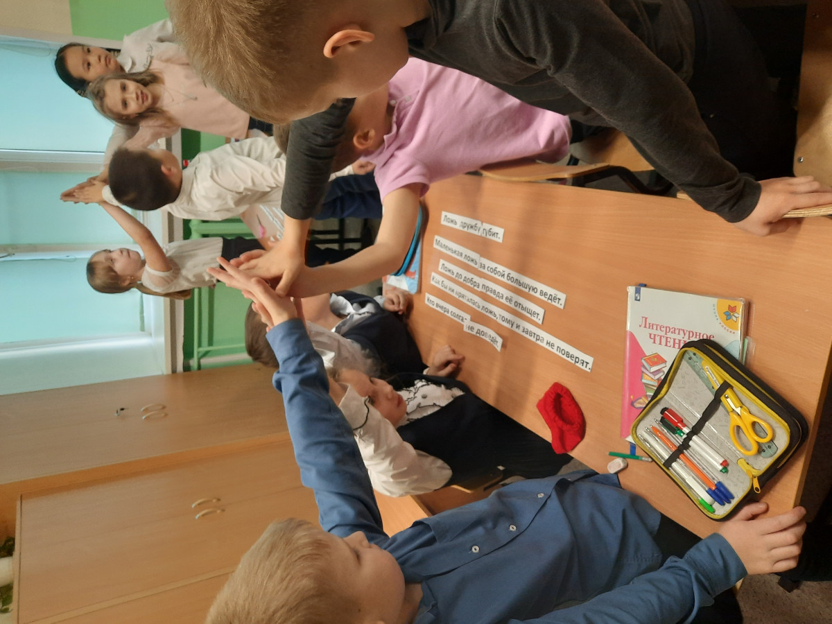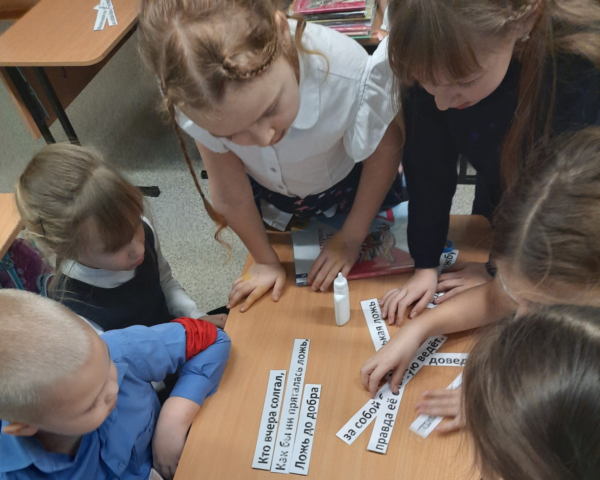 Ребята работали в командах, собирали правильно пословицы, девочку-обманщицу ребята приняли без вопросов. Потом второклассникам было предложено сделать открытку на тему честность и записать в нее самые главные правила и подарить родителям.