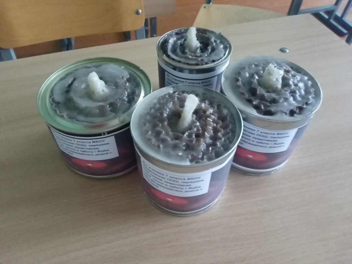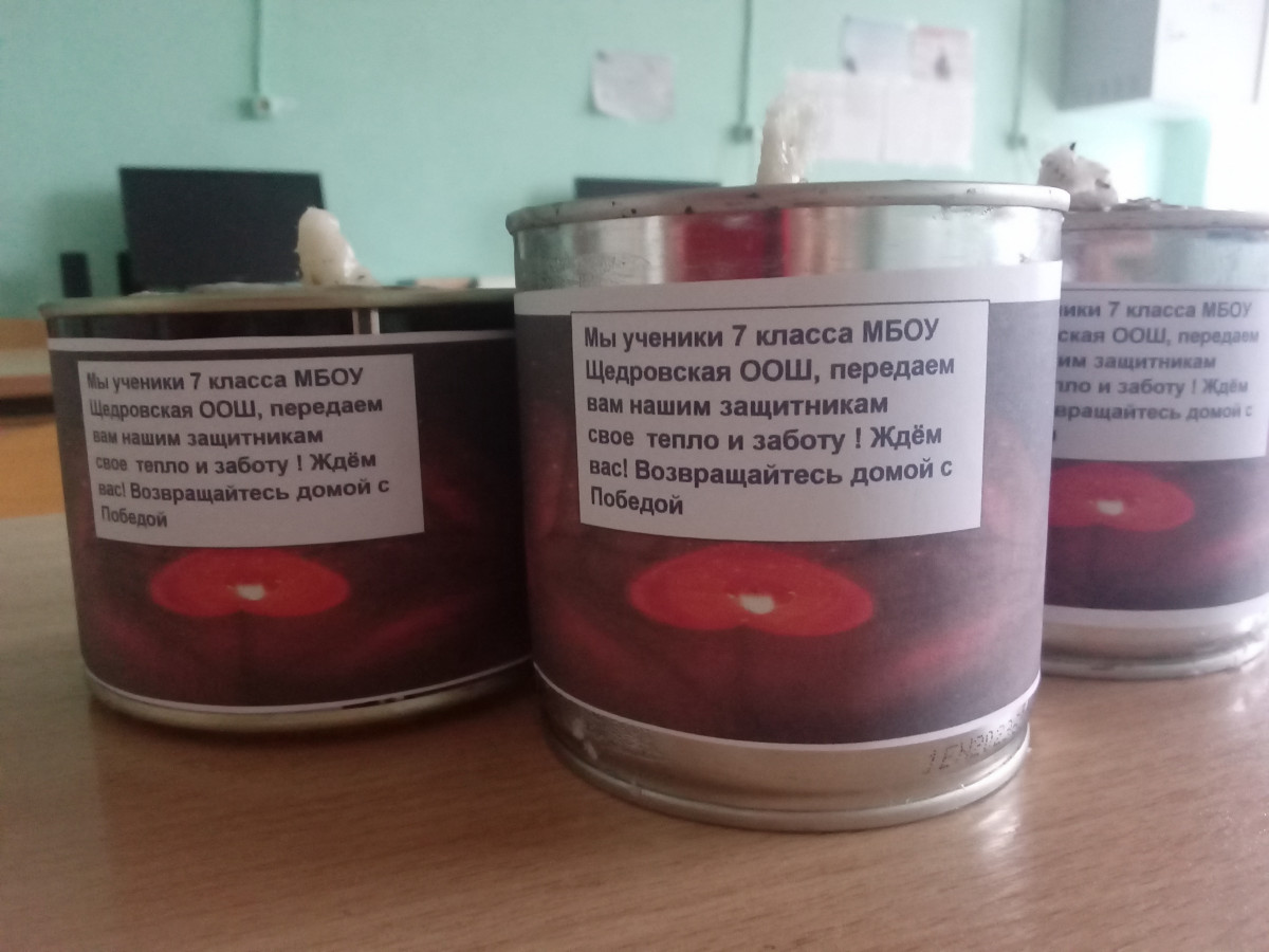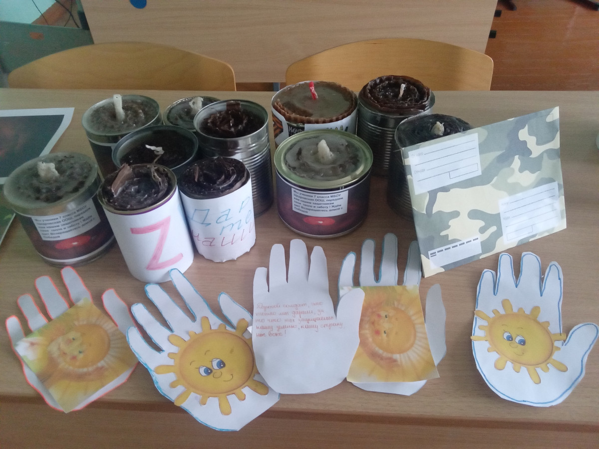 Акция "Подари тепло" из родного дома с Дона была объявлена в поселке. Инициатива принятия участия в акции исходила от ребят нашей школы. Мы решили всей школой изготовить блиндажные свечи для наших солдат принимющих участие в спецоперации на Украине. В школе вместе с классными руководителями дети приносили баночки которые заполняли гафрированным картоном , вставляли фитили. Потом заготовки забирали домой и вместе с родителями заливали парафином. В каждую баночку родители и дети вложили тепло и заботу своего дома которое согреет содат в трудную минуту. Дальше каждый ребенок вырезал из бумаги свою ладошку приклеил на нее солнышко и с обратной стороны написал слова поддержки благодарности военослужащим.