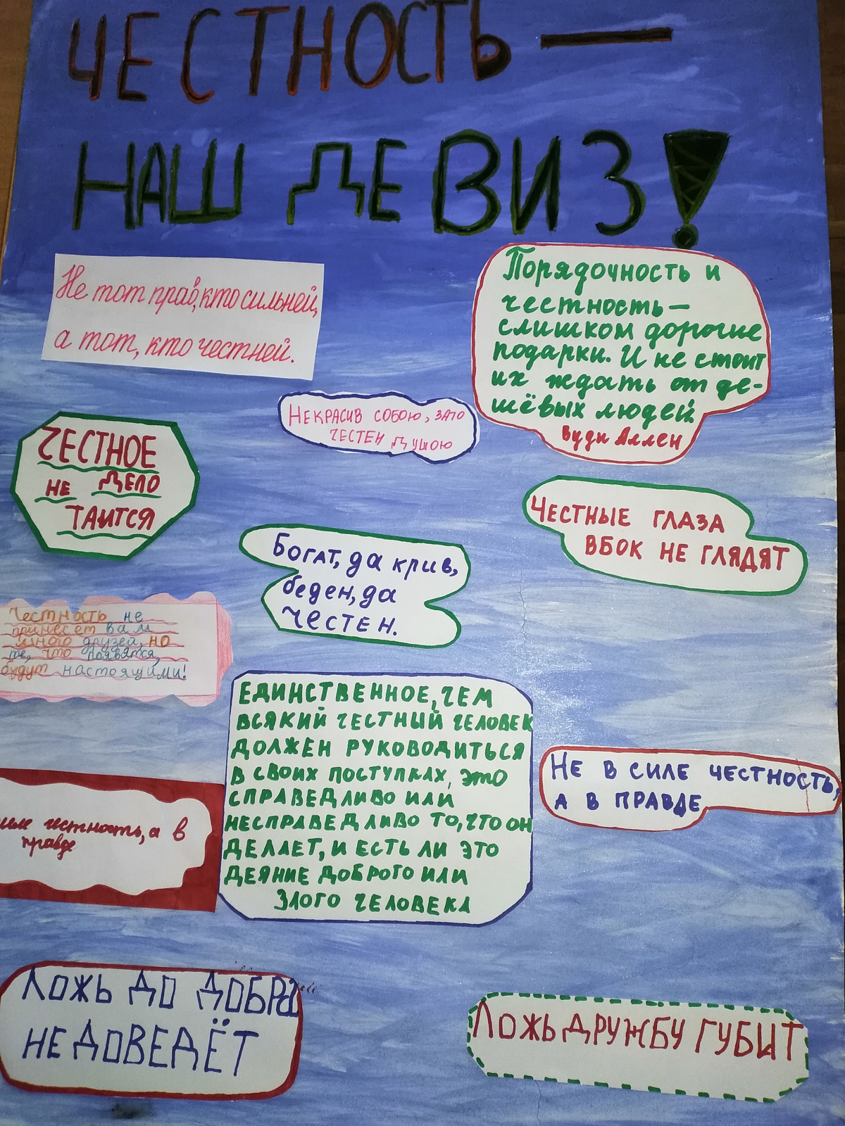 Посмотрев фильм, ребята обсудили очень важное качество, которое просматривается в фильме - честность, предложили провести классный час на тему "Честность - наш девиз". После беседы и обсуждения ребята пришли к выводу, что честность, это очень важное качество, которым должен обладать каждый уважающий себя человек. Ребята решили выпустить газету, где разместили пословицы о честности и высказывания известных людей, которые они сами подобрали.