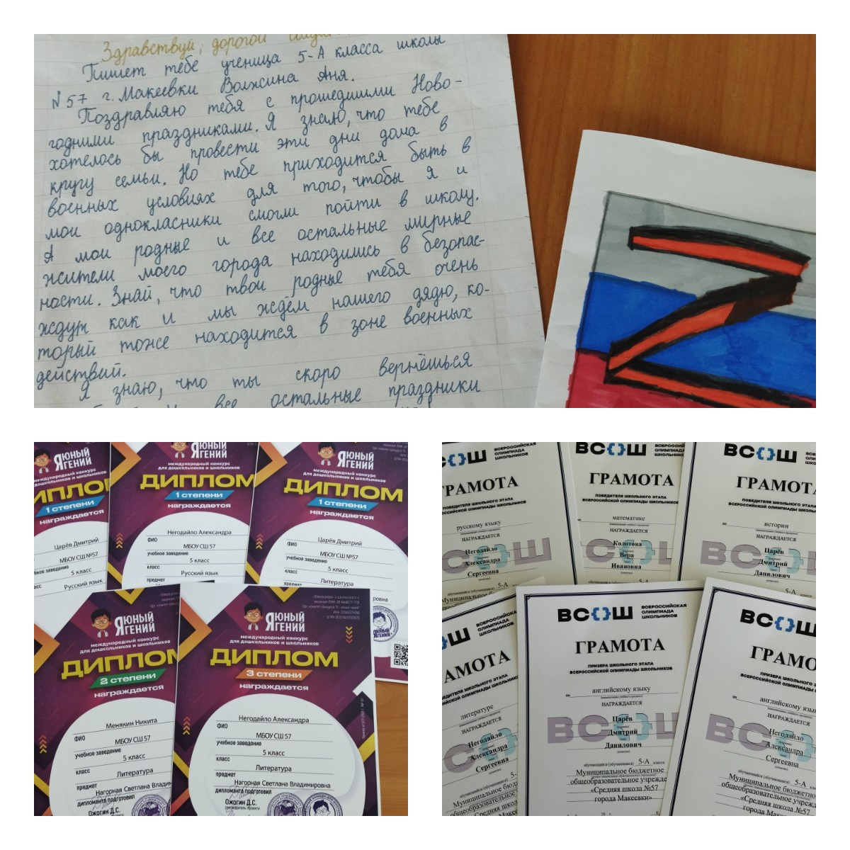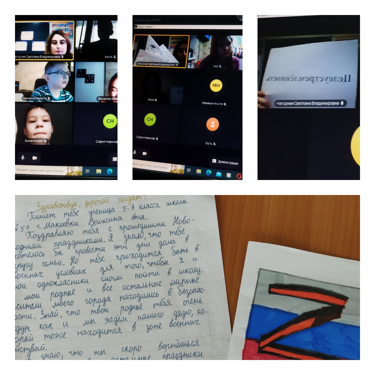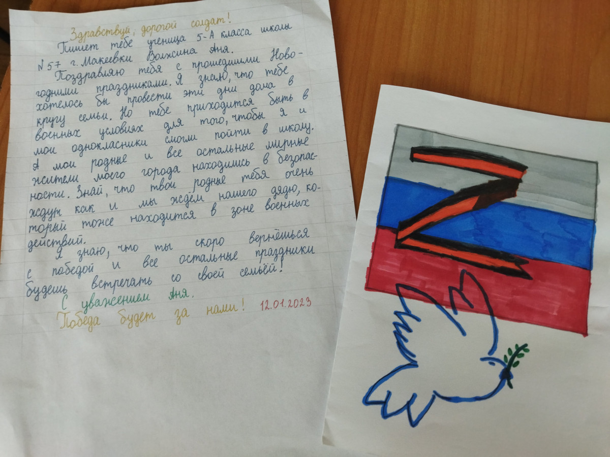 Выслушав все мнения учащихся 5-А класса по проведению общественно-полезного дела пришли к выводу, что нужно улучшать свои знания и расширять кругозор посредством всевозможных конкурсов, проектов и мероприятий. Поэтому учащиеся сразу же приступили к реализации своих замыслов, в чём им конечно же помогли не только родители, но и педколлектив. С учётом того, что на нашей территории продолжается СВО мы решили в очередной раз написать слова благодарности нашим военнослужащим и передать им частичку своей любви и признательности!