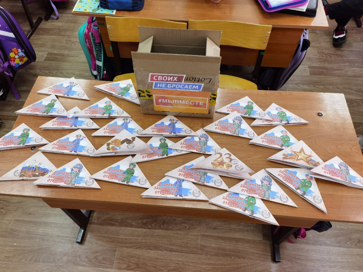 В преддверии Дня Защитника Отечества ребята решили написать письма-поздравления солдатам СВО. Вместе с конфетами посылка была отнесена в штаб, и вскоре наши Защитники получат поздравления от ребят.
