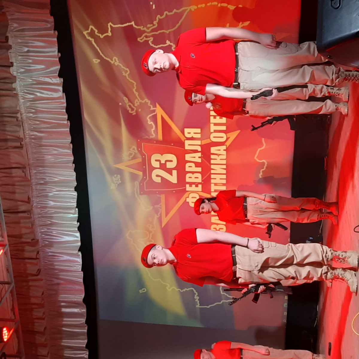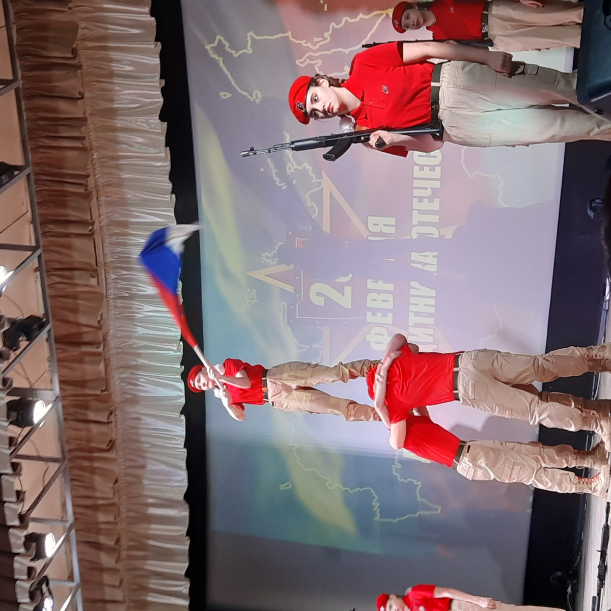 Наши школьники приняли участие в концерте. Юноармейцы из отряда "Наследники славы" показали представление с акробатическими элементами и макетами автомата Калашникова.