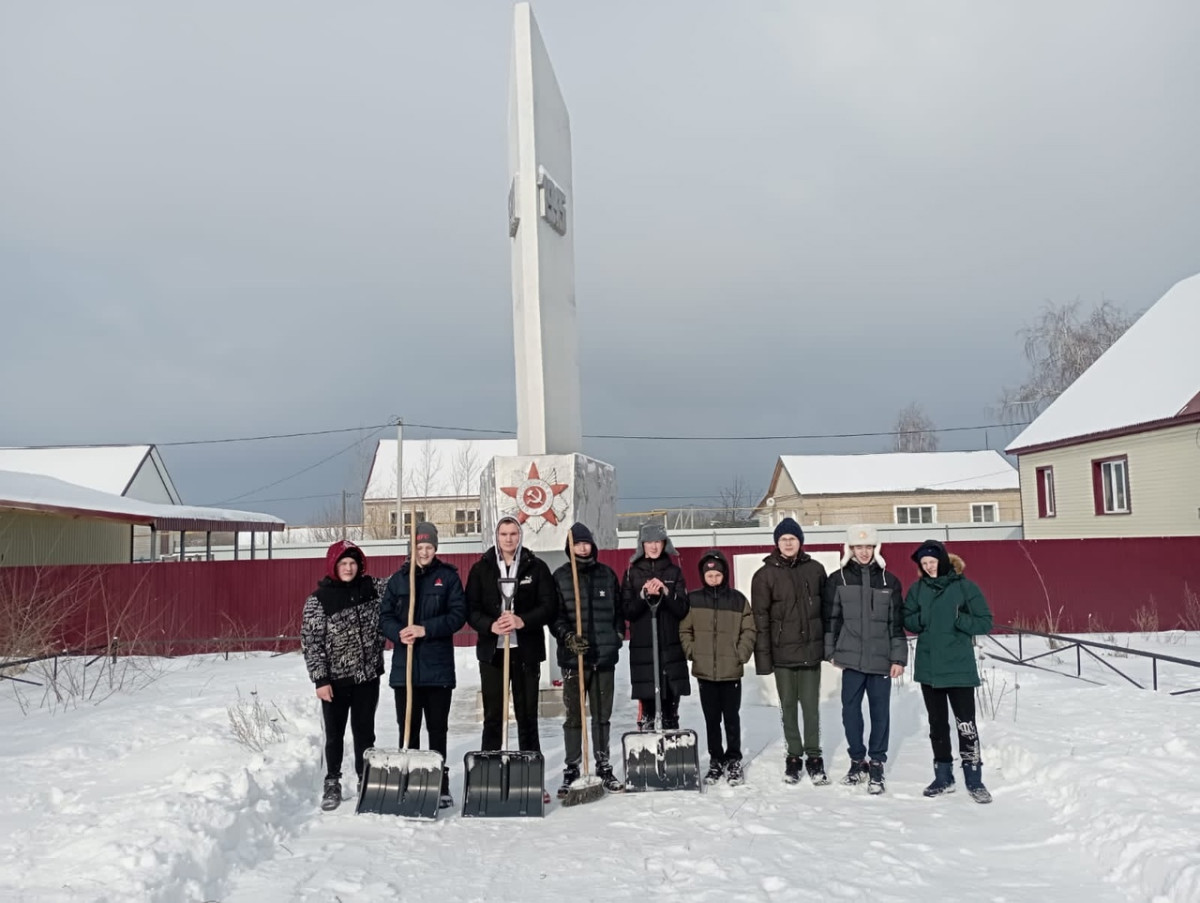 После просмотра фильма "Редкий вид" по инициативе школьников был организован "Снежный десант" для расчистки территории памятника погибшим воинам на территории нашего поселка
