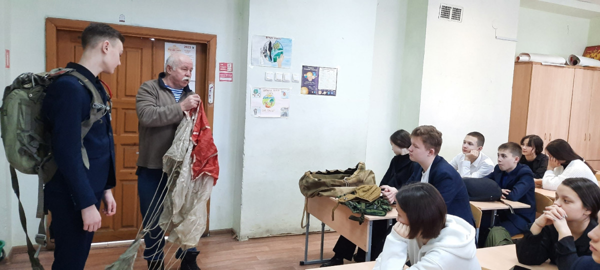 2. решили встретиться с представителем Союза десантников - Сергеем Николаевичем Михайловым, выпускником этой же школы. Ребята узнали много интересного о службе в рядах Российской армии. Так как Сергей Николаевич был десантником, он рассказал как совершается парашютный прыжок, вес рюкзака, который несёт на своих плечах десантник и попробовали примерить на себе это снаряжение. Как тяжело!.. 15 кг! А как было тяжело герою фильма, 10 – летнему мальчику Саше, который нес баян со спрятанным в него радиоприемником…Ребята сразу вспомнили эти кадры из фильма…И помимо этого, Саше нужно было выполнить качественно боевое задание в окружении врага…