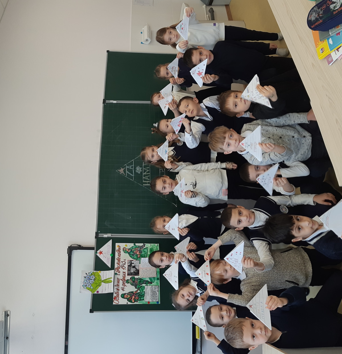 В качестве социальной практики в преддверии Дня Защитника Отечества, ученики 1 "Д" класа сделали своими руками поздравительные открытки для дедушек и пап. Отдельно, в виде треугольников, сделали и отправили открытки бойцам СВО.