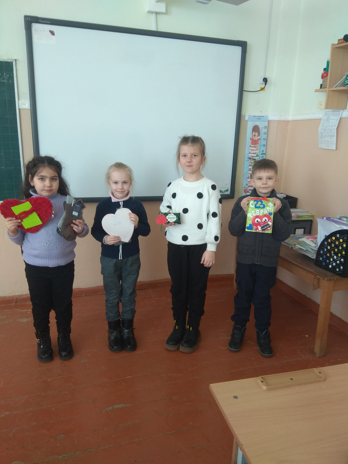 Просмотрев фильм "Воин света", мы постарались научиться отзывчивости. Наши первоклассники и их родители готовы отозваться тем. кому нужна помощь. Мы с детьми изготовили к 23 февраля сердечки участникам военных действий, а родители купили теплые носки, мыло и т.д. И пусть ещё не все первоклассники научились быть "воинами света", но учаться своими делами приносит добро.