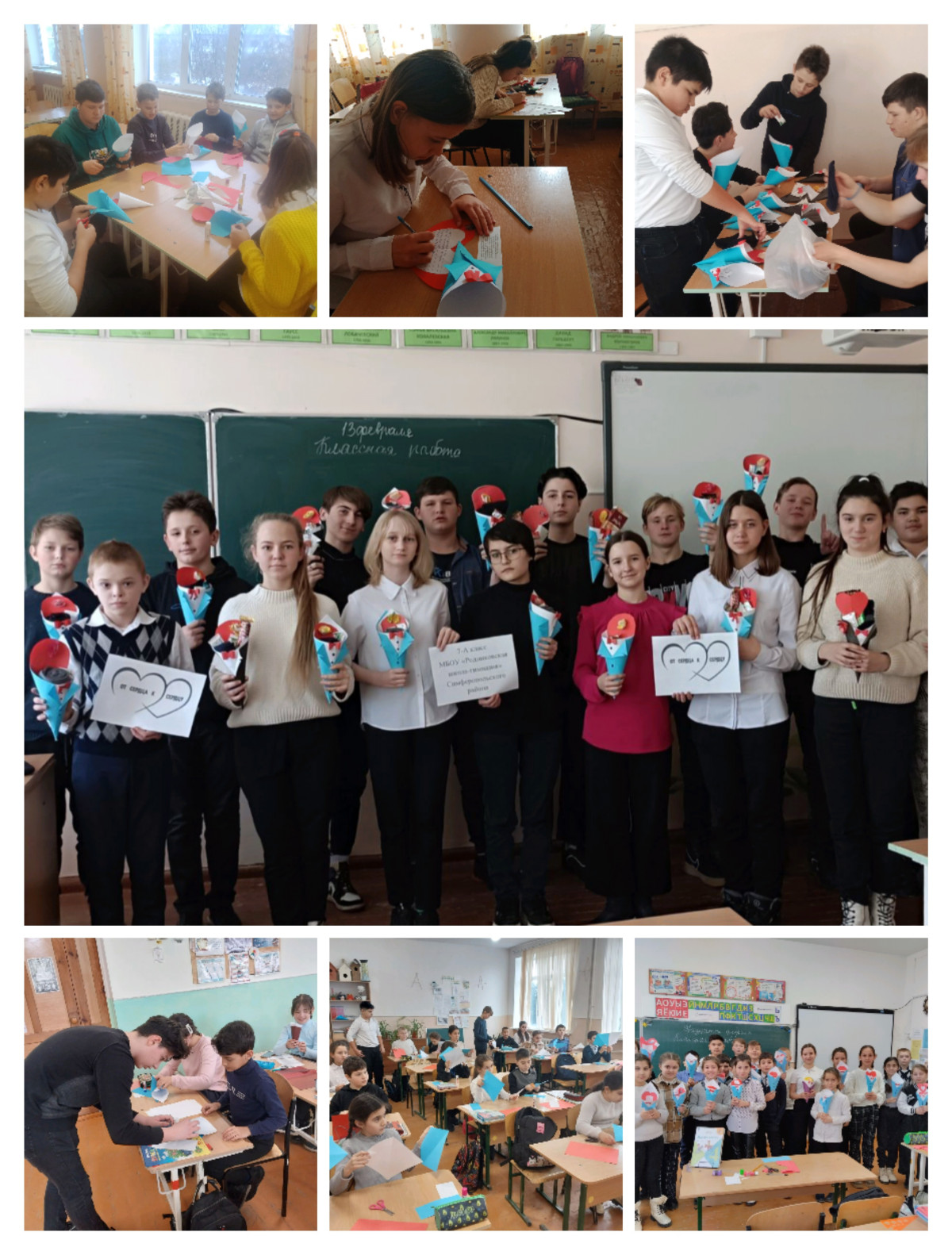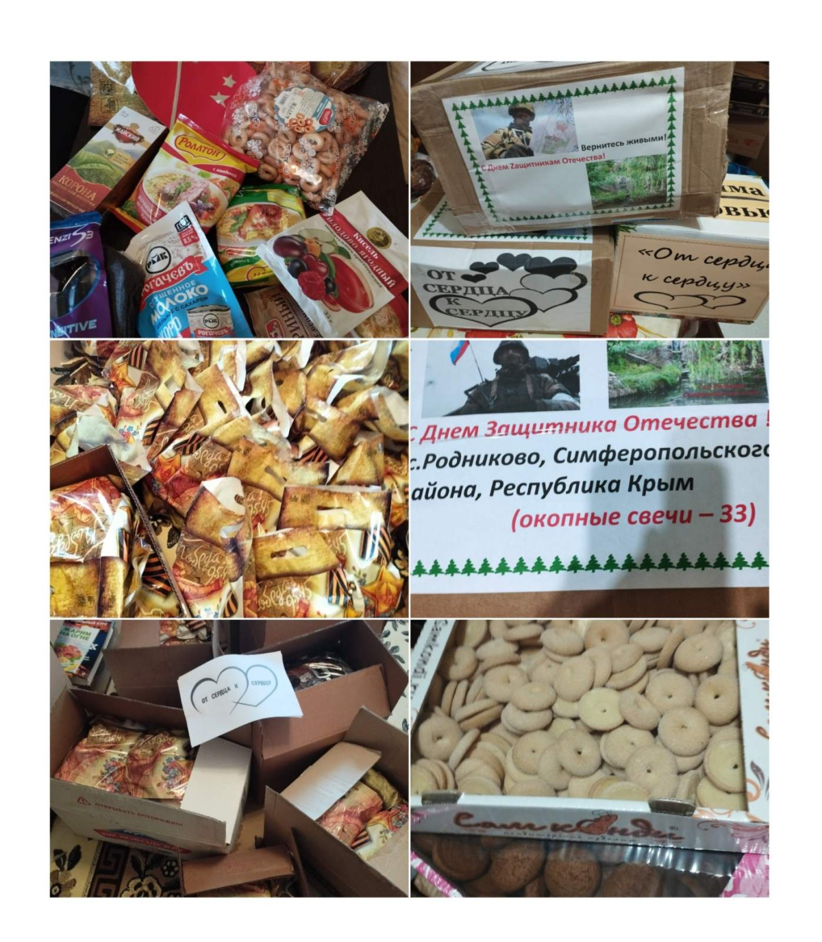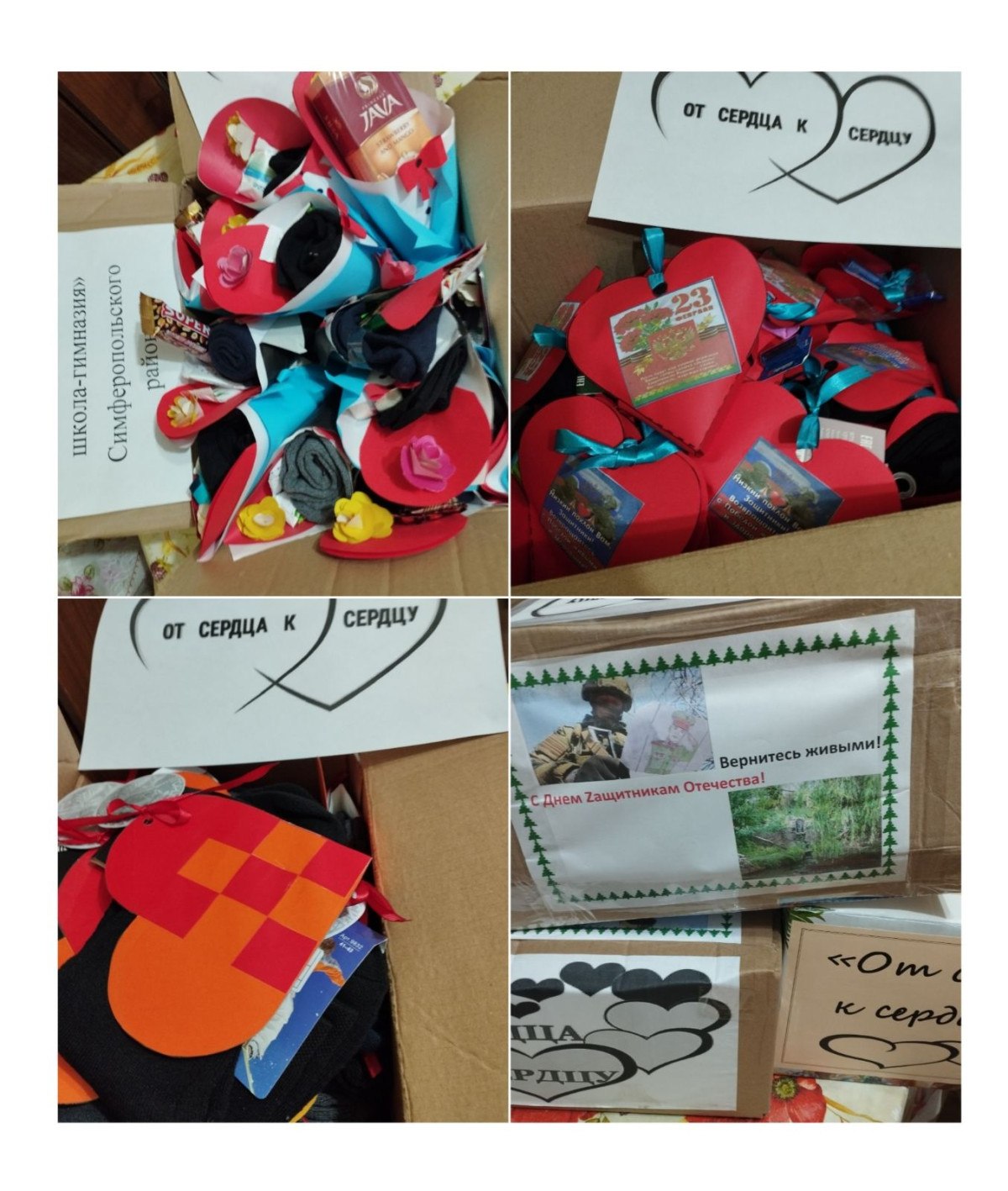 После просмотра фильма «Редкий вид» ребята еще долго рассуждали над фразой героини о том, что время разное, но враги те же и люди те же. Только все вместе своим усердием и трудолюбием, взаимной помощью и поддержкой мы можем одержать Победу в великой борьбе Добра против Зла. Помощь и поддержка каждого приближает эту Победу. Поэтому, услышав, что в стране идет акция от «Сердца к сердцу», приуроченная к празднику Дня Защитника Отечества, ребята предложили принять в ней участие и подготовить сердца-поздравления (письма нашим бойцам) и небольшие подарки в честь праздника. Откликнулись на это предложение и родители ребят, которые приобрели для бойцов предметы первой необходимости (мыло, пену для бритья, носки и другие мужские принадлежности, а также сладости). В общей сложности у нас получилось 24 подарка. Совместными усилиями подарки и письма-сердца были направлены через волонтерский штаб бойцам СВО.