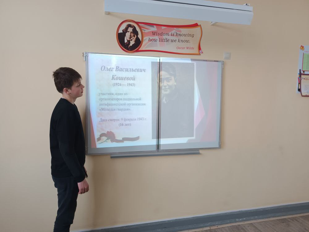 Инициатива исходила от детей. После просмотра фильма ребята предложили сделать презентацию о героях-молодогвардейцах, проявивших невероятный героизм и усердие в борьбе с фашизмом. Был подотовлен рассказ как об организации в целом, так и об отдельных её членах. Учащиеся были потрясены стойкостью, мужеством и героизмом таких юных борцов, а также прониклись чувством патриотизма.
