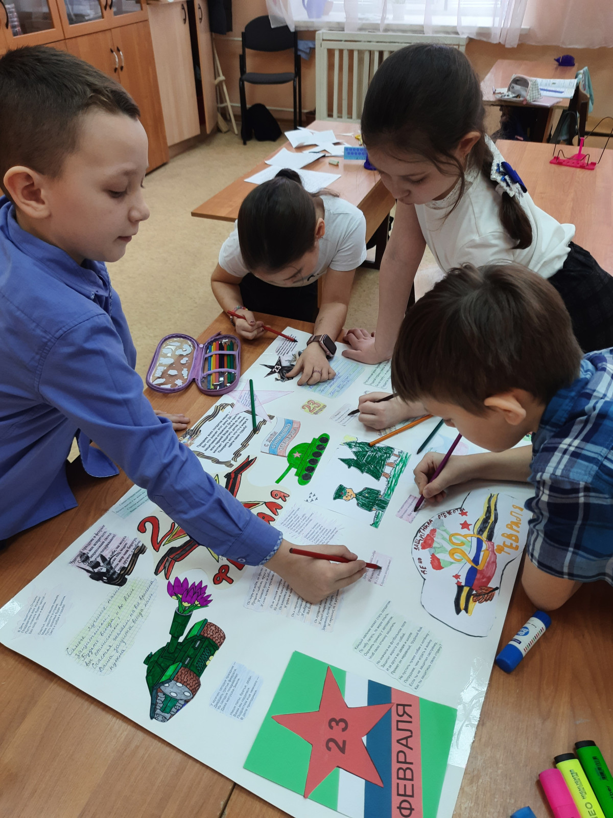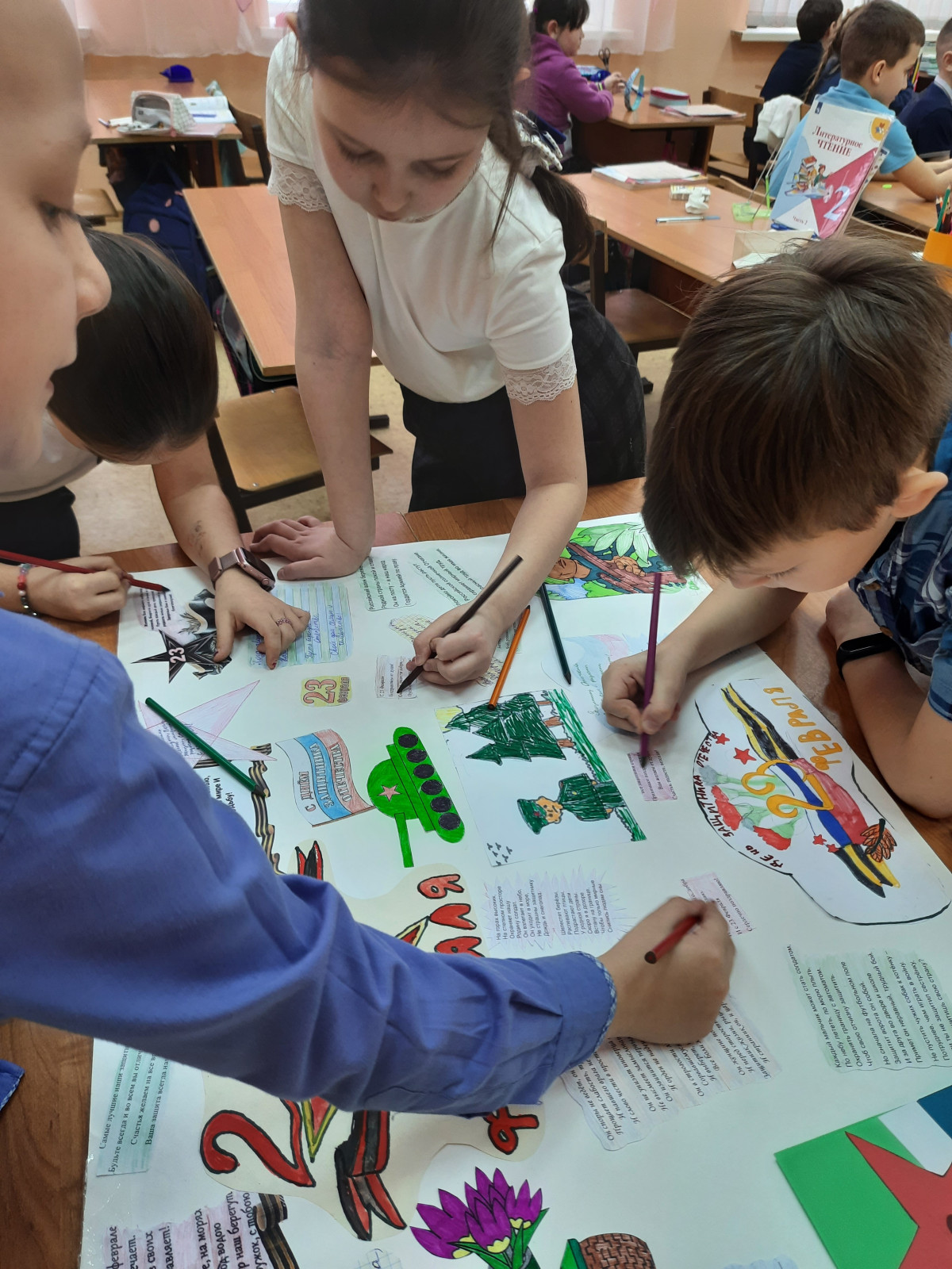 Ребята разделились на группы и выбрали себе задания: принести фотографии и рисунки на военную тему, подобрать праздничные поздравления и стихотворения, оформить стенгазету, повесить её на входе в школу.