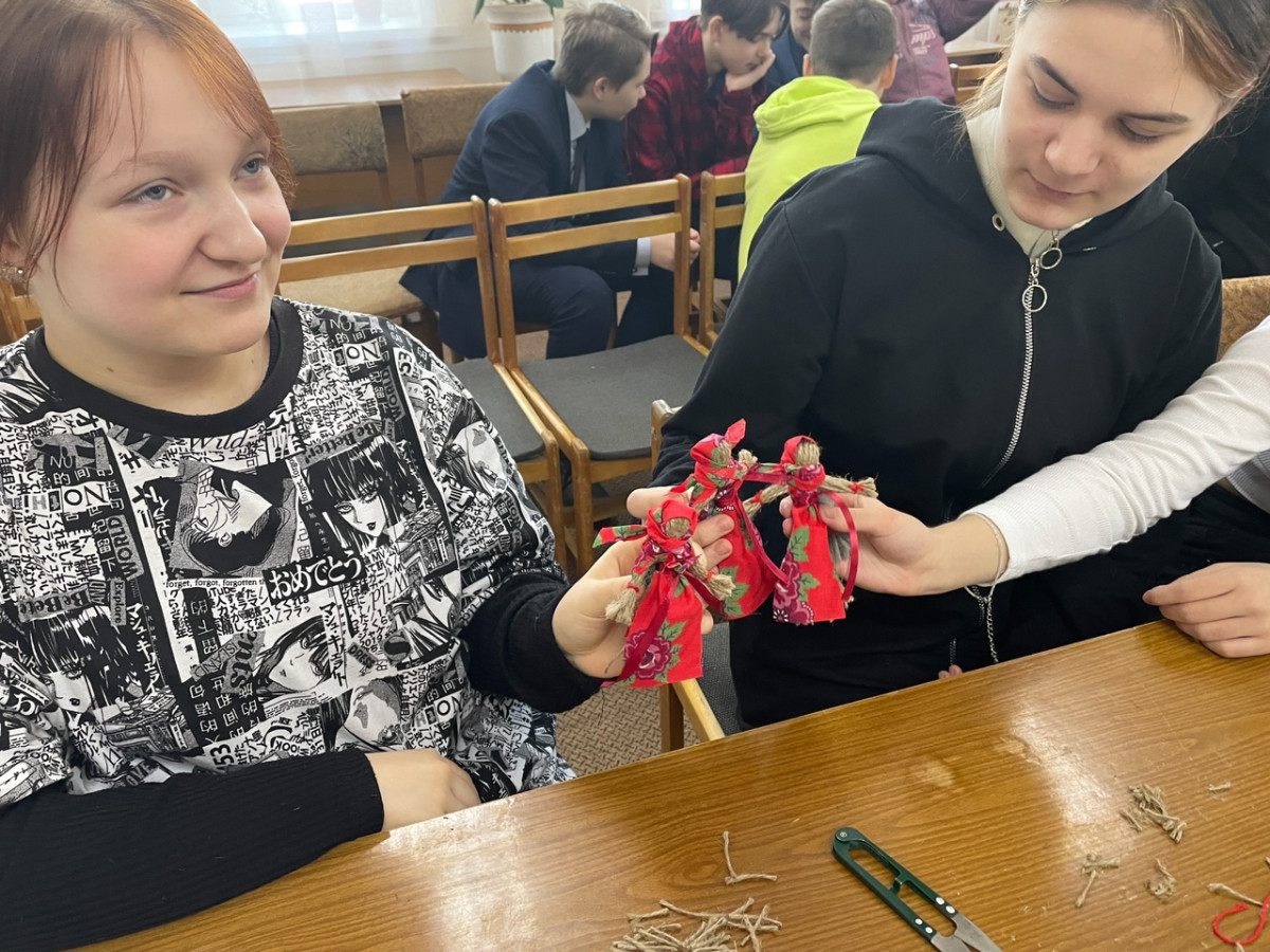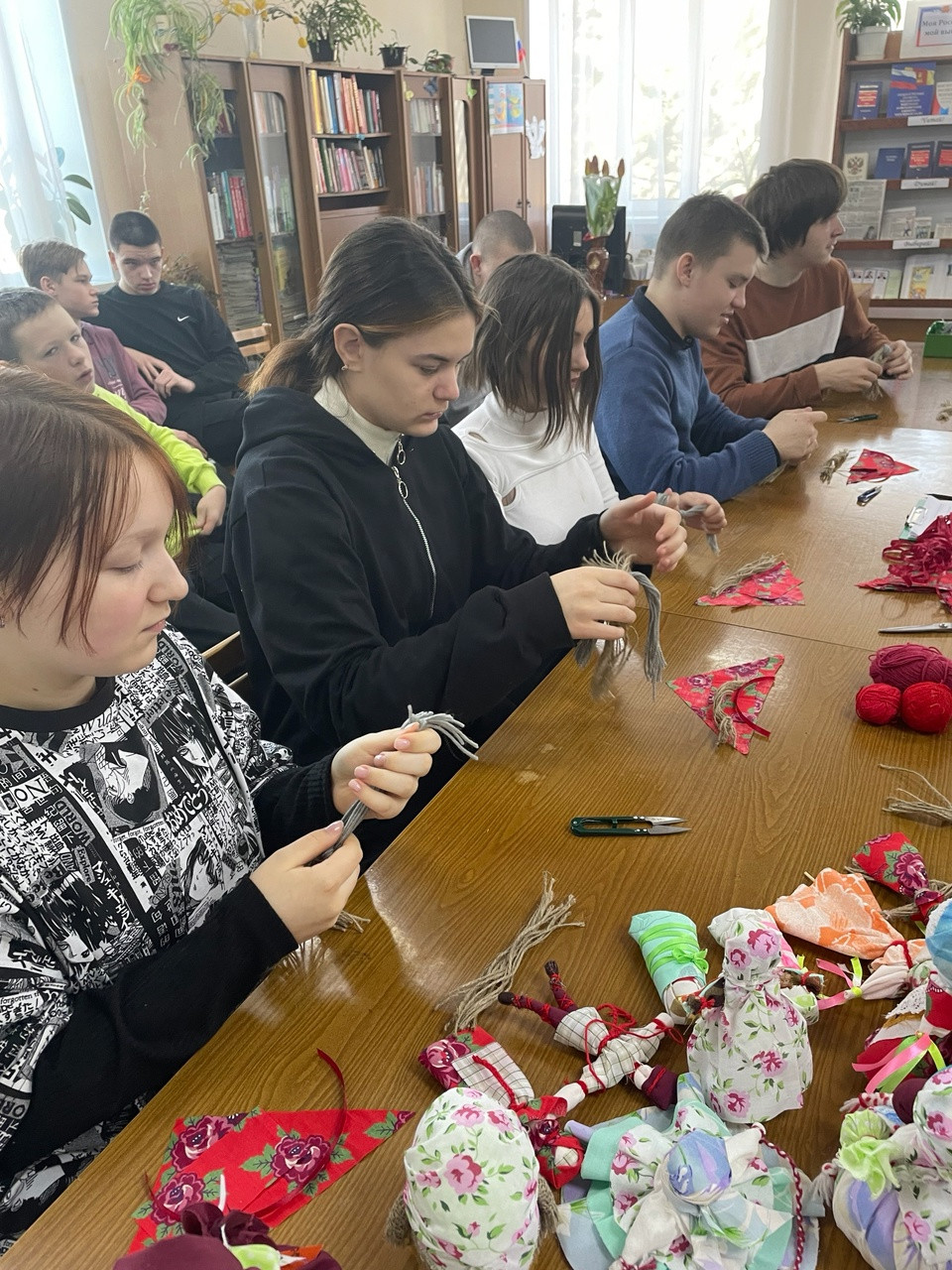 3. На мероприятии ученики 9 а класса рассказали о русской культуре, о традициях ,семейном укладе, подготовили презентацию с разными видами кукол. Затем все вместе с работниками библиотеки мастерили куклы, которые подарили младшим сестрёнкам, братишкам, мамам.