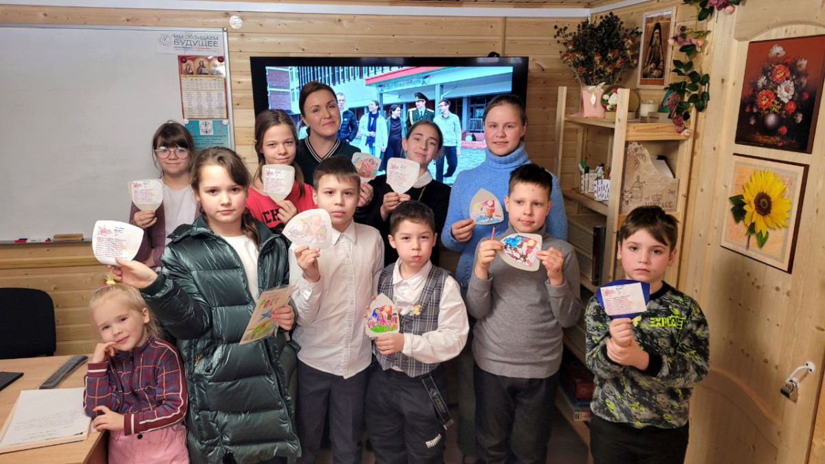 В День Защитника Отечества учащиеся Духовно-просветительского центра Подворья Патриарха Московского и всея Руси при храме св.ап. Андрея Первозванного посмотрели очередной фильм Международного культурно-гуманитарного проекта «О будущем», реализующего систему воспитания «Киноуроки в школах России и мира». В ходе Киноурока добра была рассмотрена тема: «Патриотизм как чувство ответственности за Родину». По окончании просмотра, дети обсудили сюжетную линию, сделали выводы на основе православного вероучения, рассказали о христианских добродетелях, пример которых явил главный герой фильма. В качестве практики ребята смастерили «Щиты добра» с изображением святого праведного князя Александра Невского, а также цитатами о любви, уважении, добре и молитве из Священного Писания. 1 апреля открытки вместе с гуманитарной помощью будут направлены в зону СВО для духовной поддержки воинов.