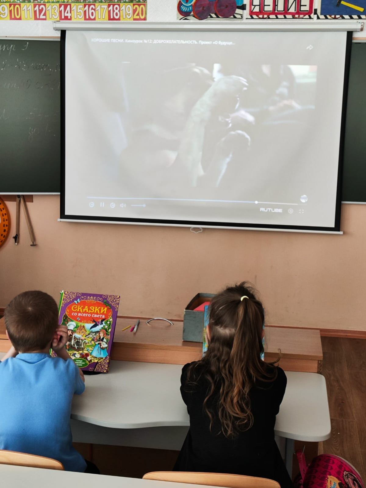 В рамках проекта "Киноуроки в школах России" учащиеся 1 класса посмотрели фильм "Хорошие песни". Фильм очень детям понравился, оставил в их душах много положительных моментов. Он заставил о многом задуматься: надо быть внимательными, дружелюбными к людям, обдумывать свои поступки.