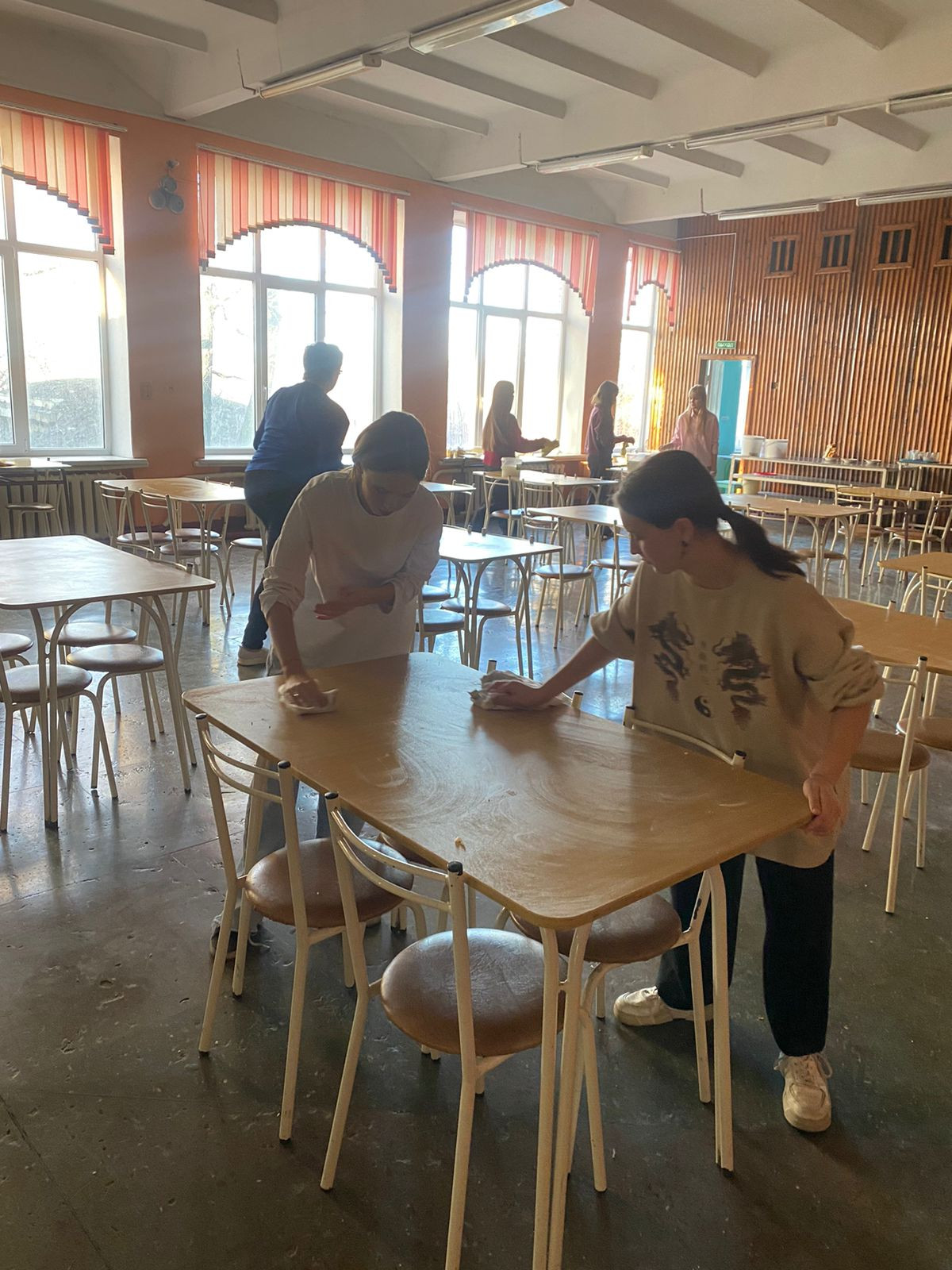 Девочки 9 «Б» класса поучаствовали в генеральной уборке школьной столовой: тщательно почистили и вымыли столы и стулья. Эта работа принесла им чувство удовлетворения, ощущение хорошо выполненного полезного дела. Чистота и уют улучшают настроение, концентрацию внимания, увеличивают энергичность и творческий потенциал, а также может обезопасить от множества болезней.