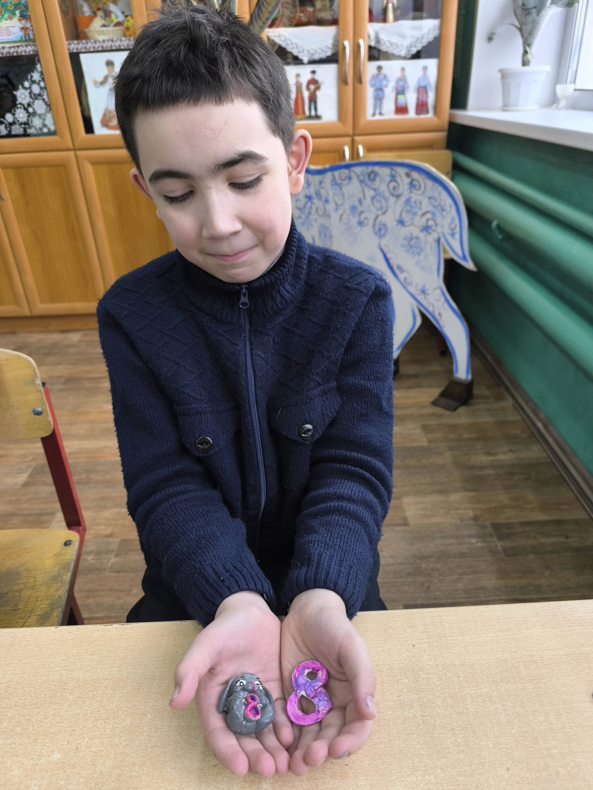 Ребята всю неделю готовились к празднику 8 марта. Ребята выучили стихотворения для своих любимых мам , бабушек и сестрёнок. А также подготовили сувениры. Обучающиеся подготовили из глины чудесные восьмёрки и очень милых зайчиков Раскрасили заготовки акриловыми красками. Из восьмёрки получился замечательный магнит , а зайку можно использовать как брелок для ключей. Но на этом ребята не остановились. Ребята посетили экскурсию в г. Торжке. Там они познакомились с работами Торжских золотошвей и приняли участие в МК по вышиванию салфетки для мамы с первой буквой ее имени. У каждого из нас есть возможность делать добрые дела и оставлять добрый след в сердцах других людей.В предверьи праздника дети поздрвили своих мам и бабушек с празником и поблагодарили своих близких за внимание и заботу!