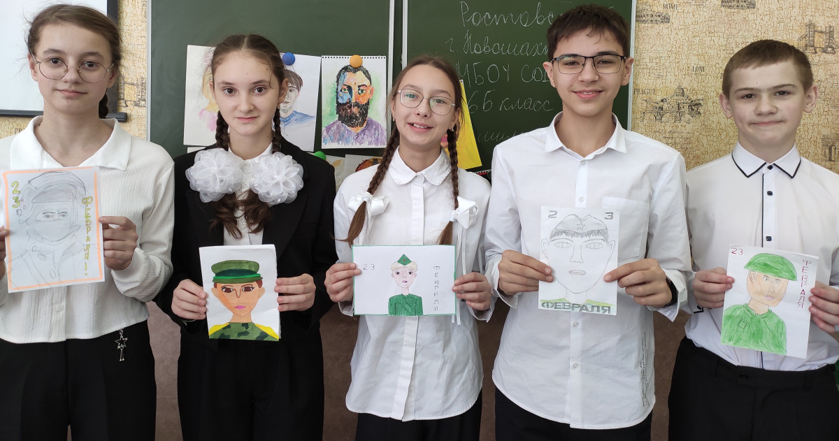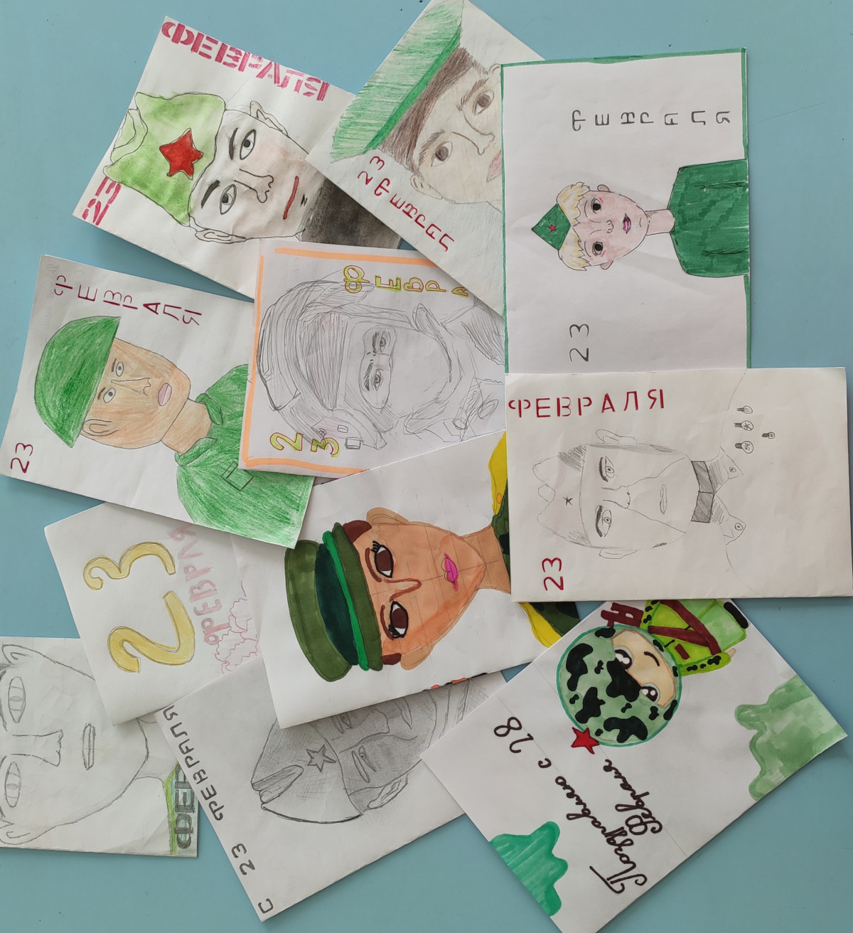 В качестве социальной практики решили сделать своими руками праздничные поздравления в виде открыток и изобразить на них лица солдат. Эти открытки отправили бойцам на фронт.