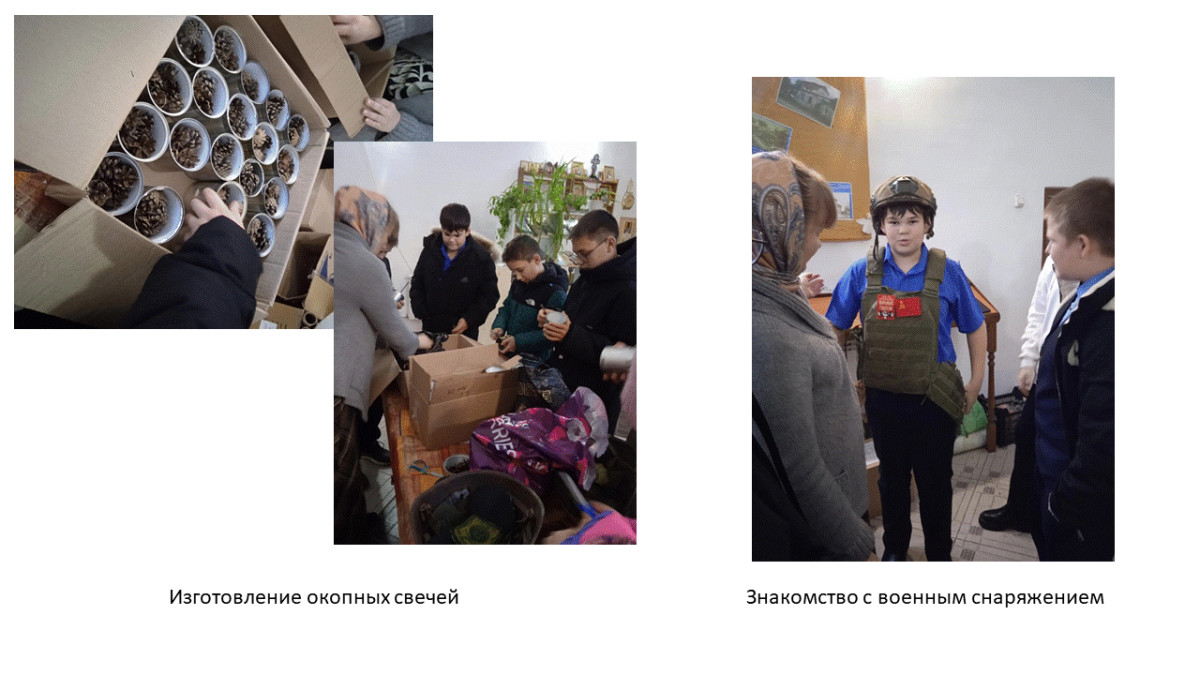 5) Приняли участие в изготовлении окопных свечей при Храме в честь Владимирской иконы Божией Матери. Здесь матушка Елена провела нам мастер-класс как изготовить блиндажную свечу. Выяснили, что для них нужны жестяные банки, парафин и шишки. Ребята помогали собирать жестяные банки, раскладывать в них шишки и укладывать фитиль. Узнали, чтобы такая свеча не коптила, хорошо грела и как можно дольше горела шишки должны быть сосновыми и обязательно сухими. Ведь от этого зависят чьи-то жизни. А отец Николай рассказал нам про подвиги наших земляков в зоне СВО и дал примерить военное снаряжение, которое привозит из-за ленточки во время гуманитарного конвоя.