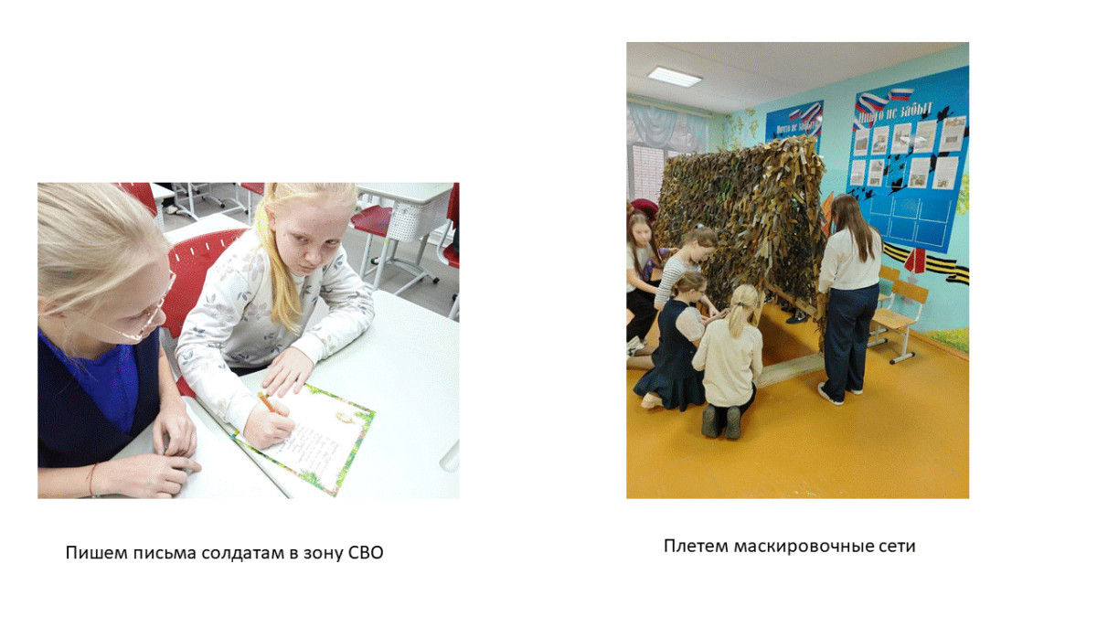 4) Оказали помощь в плетении маскировочных сетей в зону СВО. Здесь сотрудничали с советником по воспитанию, чтобы наши письма и сети ушли в пункт сбора помощи в администрацию нашего района.