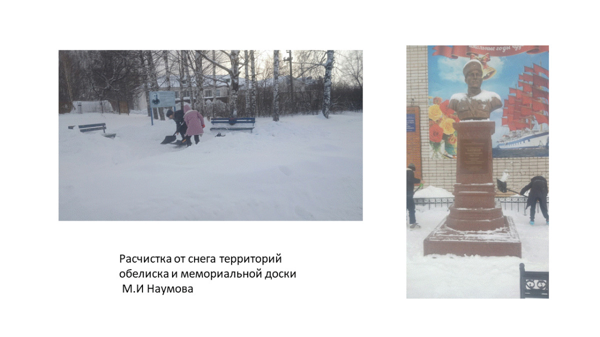 2) Расчистили от снега обелиск М.И. Наумова, находящийся на территории школы.