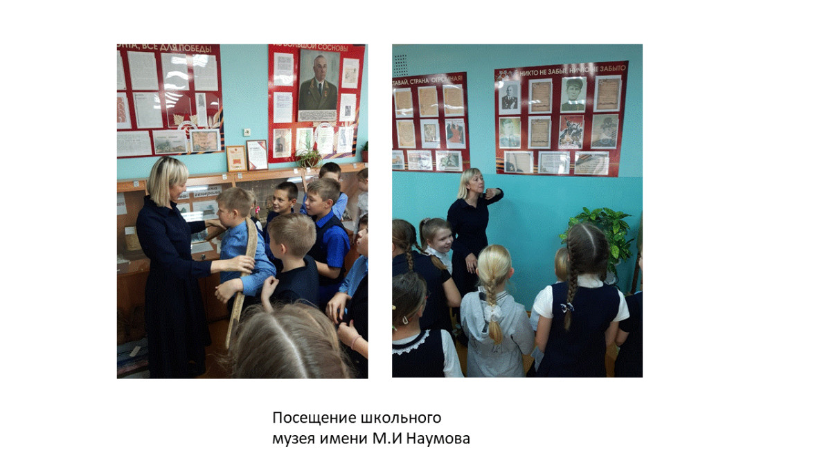 1) Посетили школьный музей имени Наумова. Здесь мы сотрудничали с учителем истории, который поближе познакомил нас с подвигами Наумова и партизанским бытом.