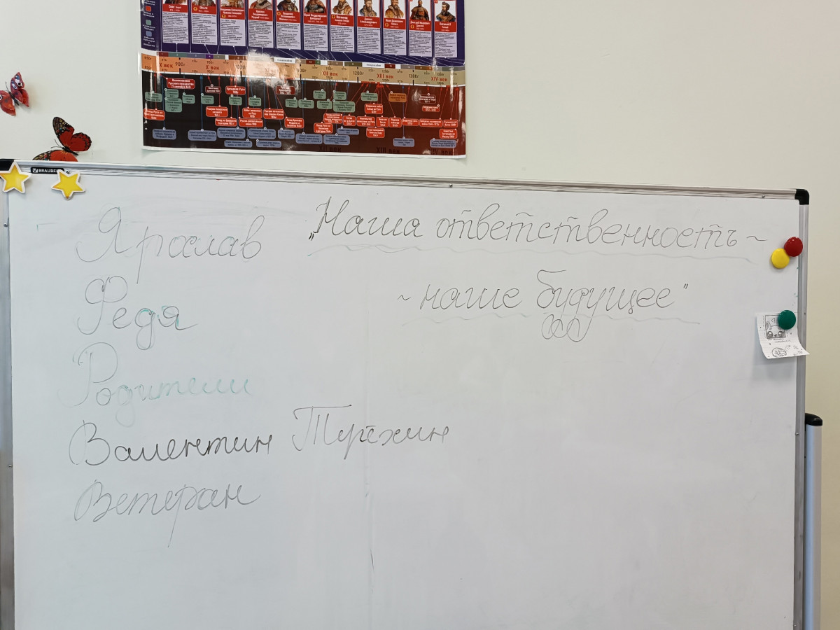 Вместе с школьниками и классным руководителем соотнесли понятие качества личности "Ответственность" с защитой Родины, что все это взаимодополняемо. Школьники осознали важность мирного неба над головой, свободы передвижения, жить полноценной жизнью без опасения.
