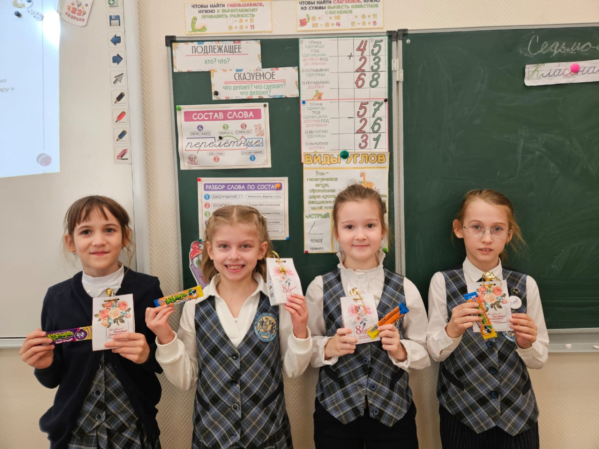 Ребята в предверии 8 марта поучаствовали в классной викторине по командам и выявили, кто из всех самая умная, ловкая сильная, смелая. Итогом этой викторины стало поздравление юных красавец класса.