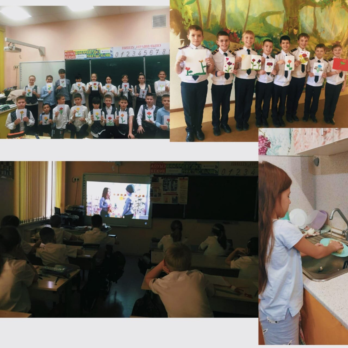 7 марта учащиеся 3«А» и 4 «Г» классов в рамках проекта «Киноуроки в школах России» посмотрели короткометражный художественный фильм «8 марта». Перед началом фильма ребятам был проведен классный час о понятии «милосердие», «внимательность», как способностью человека быть неравнодушным к окружающему миру. После просмотра и обсуждения фильма, в преддверии весеннего праздника международного женского дня 8 марта нашей социальной практикой стала неделя «Добрых дел» и ребята решили проявить внимание к своим педагогам, мамам и всем женщинам. Ребята сделали своими руками поздравительные открытки , дома дети были «мамиными» помощниками. Все вместе своими делами подарили окружающим внимание, улыбки и хорошее настроение.
