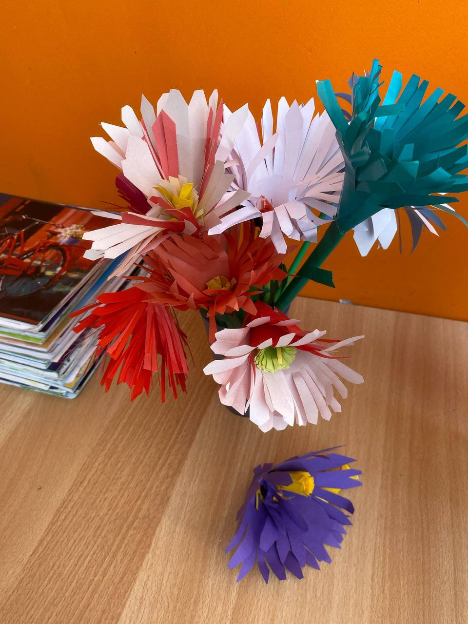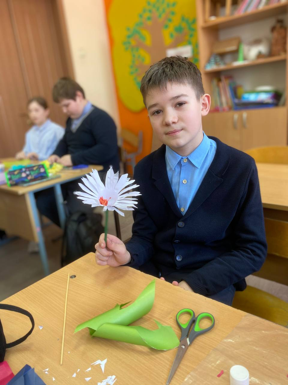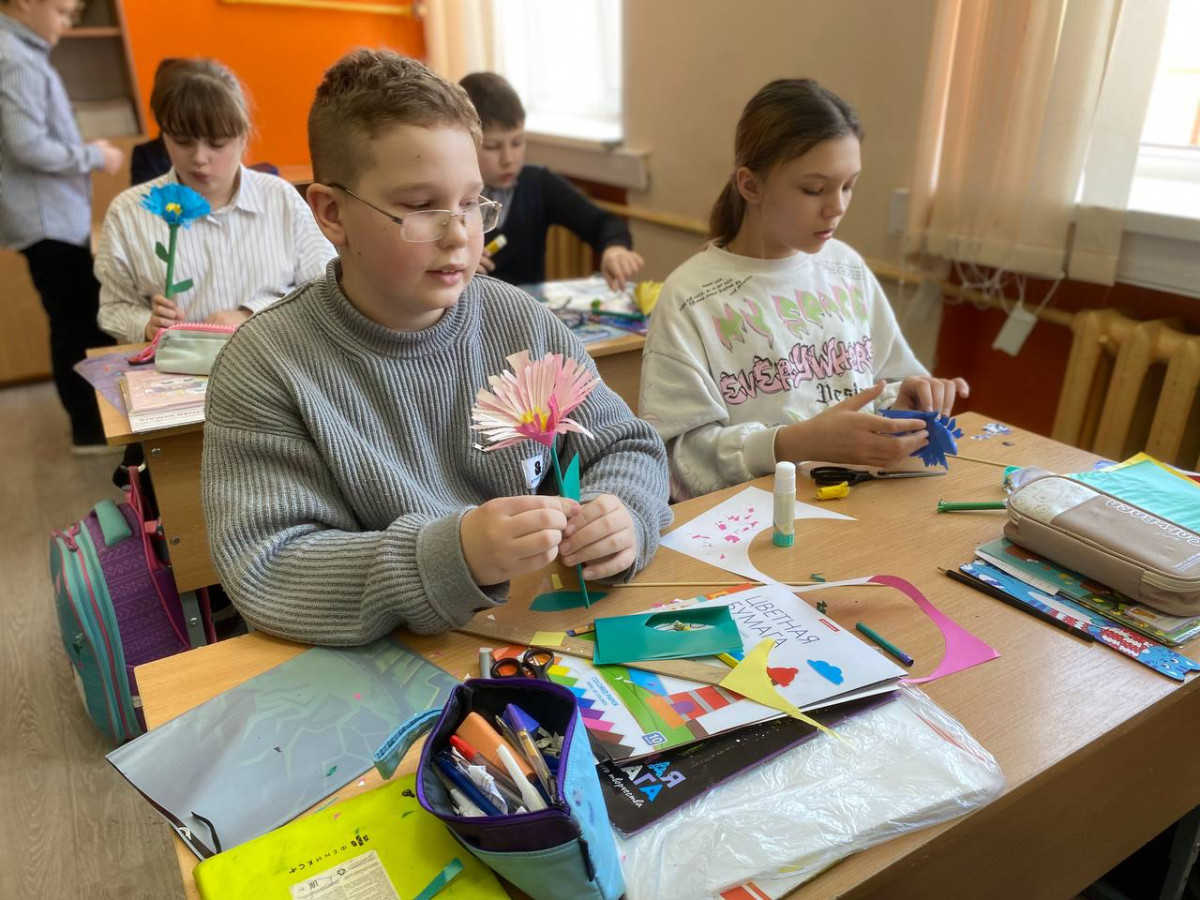 Вот и ребята решили поделится своей улыбкой с окружающими. Они предложили изготовить цветы из бумаги и подарить их своим учителям и прохожим на улице.