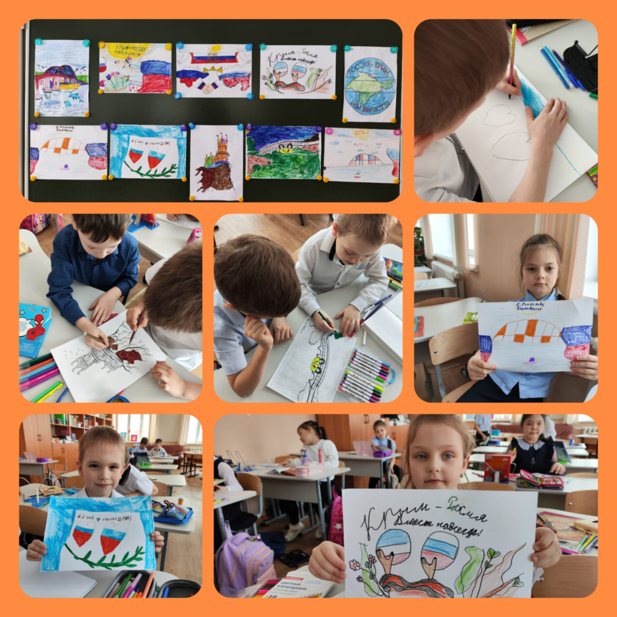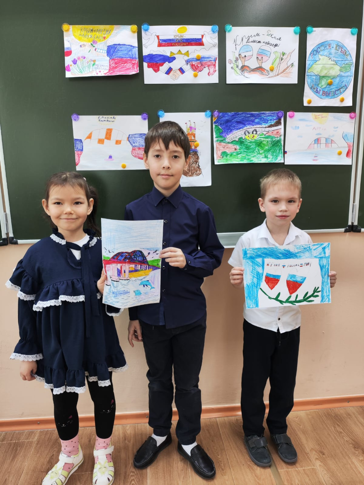 В преддверии праздника, присоединение Крыма и Севастополя к России, ребята предложили нарисовать рисунки и сделать выставку по теме. Работали парами и индивидуально, по желанию. После подвели итоги. Ребята сами выбирали лучшие работы в ходе голосования. Среди пар победителем вышли Богдан и Люба, а в индивидуальных работах – Влад.