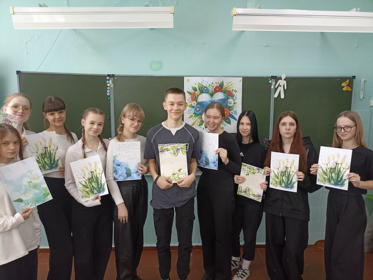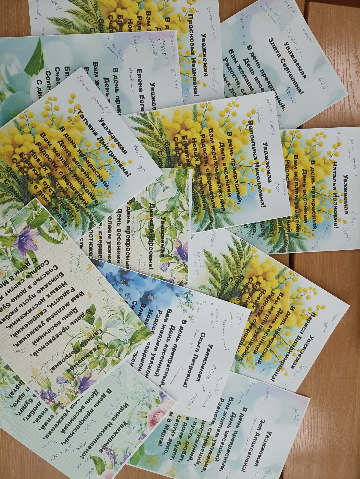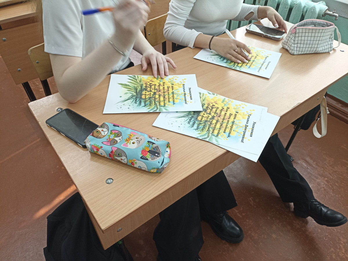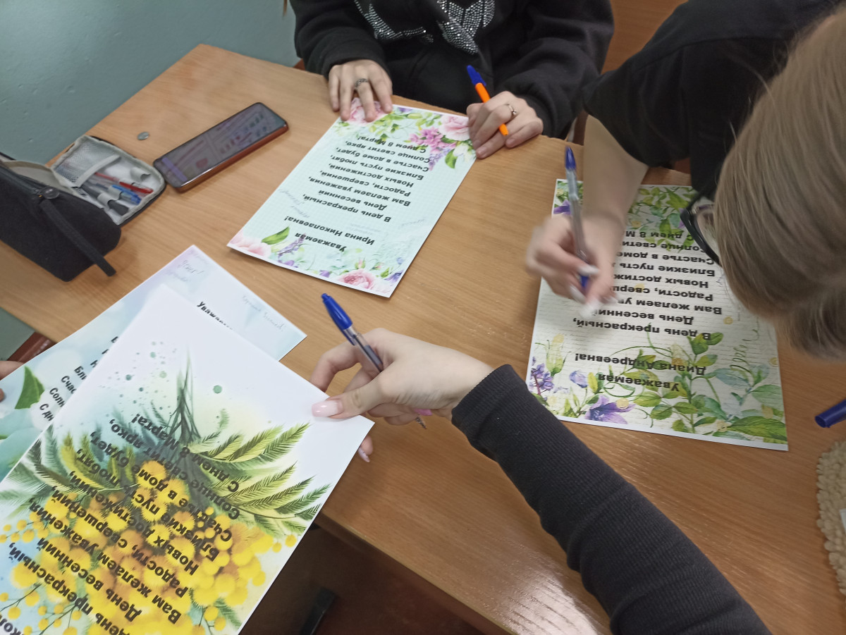 Отдельно ребята собирались подписывать открытки мамам и женщинам-педагогам. Никита для этого нашел красивые картинки и распечатал дома.