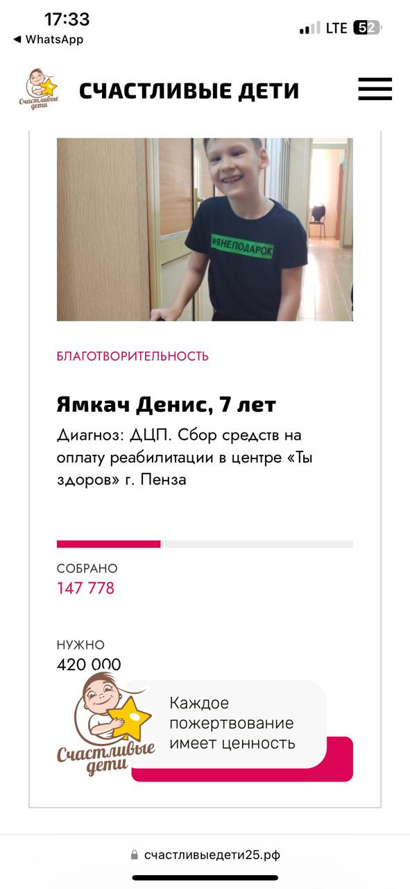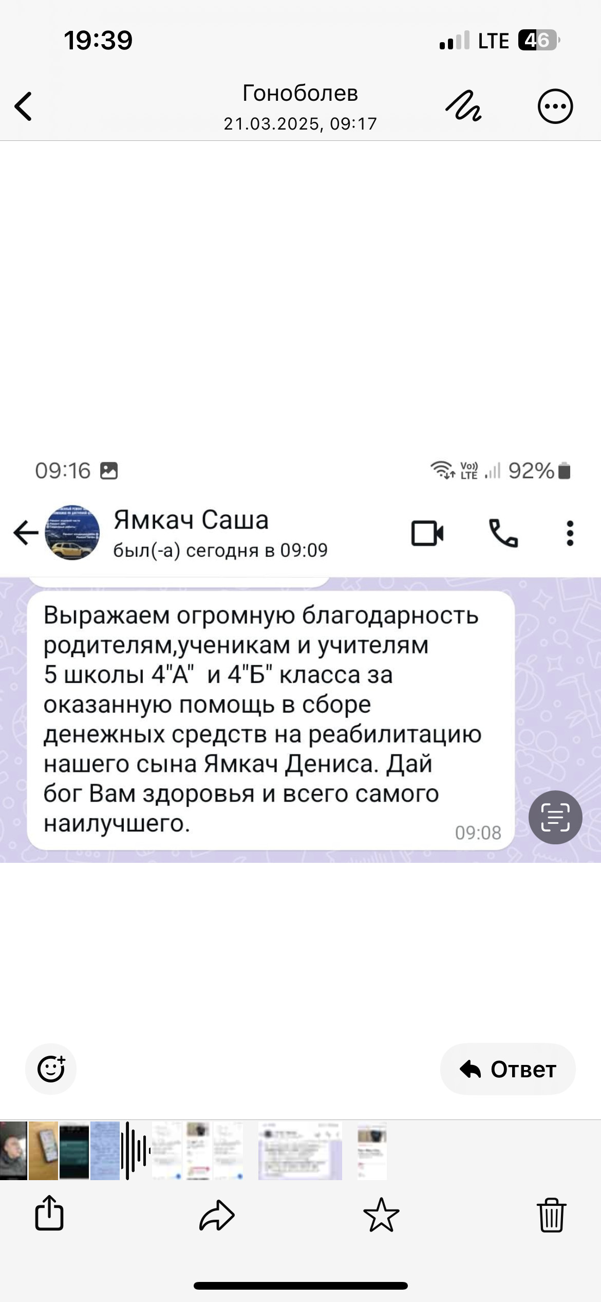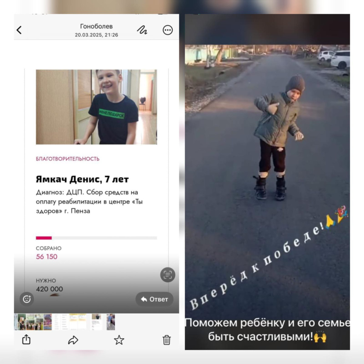 Ребята 4 "А" класса просмотрели киноурок "8 марта" и в ходе обсуждения сюжета фильма пришли к выводу о том, насколько важно быть внимательным и наблюдательным к другим людям. Т. К. в школе наступает каникулы ребята совместно с классным руководителем, по сложившейся традиции, собирались посетить кинотеатр. Дети предложили социальную практику - отказаться от вкусняшек в кино в пользу больных деток. Проголосовав,все четко решили, что поделятся с родителями своей идеей и потратят деньги на благотворительность. К идеи ребят активно присоединились родители и педагоги школы. Одна из мам предложила совершить акт благотворительности точечно. В нашем городе живет мальчик , который болен ДЦП. И его семья нуждается в сборе денежных средств для операции и реабилитации Дениса. В течении нескольких дней ребятам 4 класса удалось собрать материальную помощь для семьи Якмач. Классный руководитель поделились своей идеей в социальных сетях. И им удалось подключить к сбору не только своих родителей и учителей, но и неравнодушных жителей города. После - классный руководитель осуществил перевод собранных средств отцу мальчика. Родители выразили слова благодарности своим юным помощникам. После проделанной работы ученики 4 "А" класса пришли к выводу о том, что внимательность играет огромную роль в поддержке окружающих людей. И каждый маленький человек способен перевернуть целый мир, если будет действовать во благо другим людям. "Главное - никогда не сомневаться , что у тебя может не получиться помочь. Потому что если ты искренне этого хочешь, то все обязательно получится" - поделились своими впечатлениями ребята. Ребята, родители и учителя собрали 12500 рублей. Они разместили посты о сборе средств для Дениса на своих страничках соцсетей. Жители города откликнулись и продолжают сбор денежных средств. Сумма на счету увеличилась на 91 628 рублей. Средства до сих пор поступают от неравнодушных граждан. На сегодня сумма собранных средств равна 154300 рублей.
