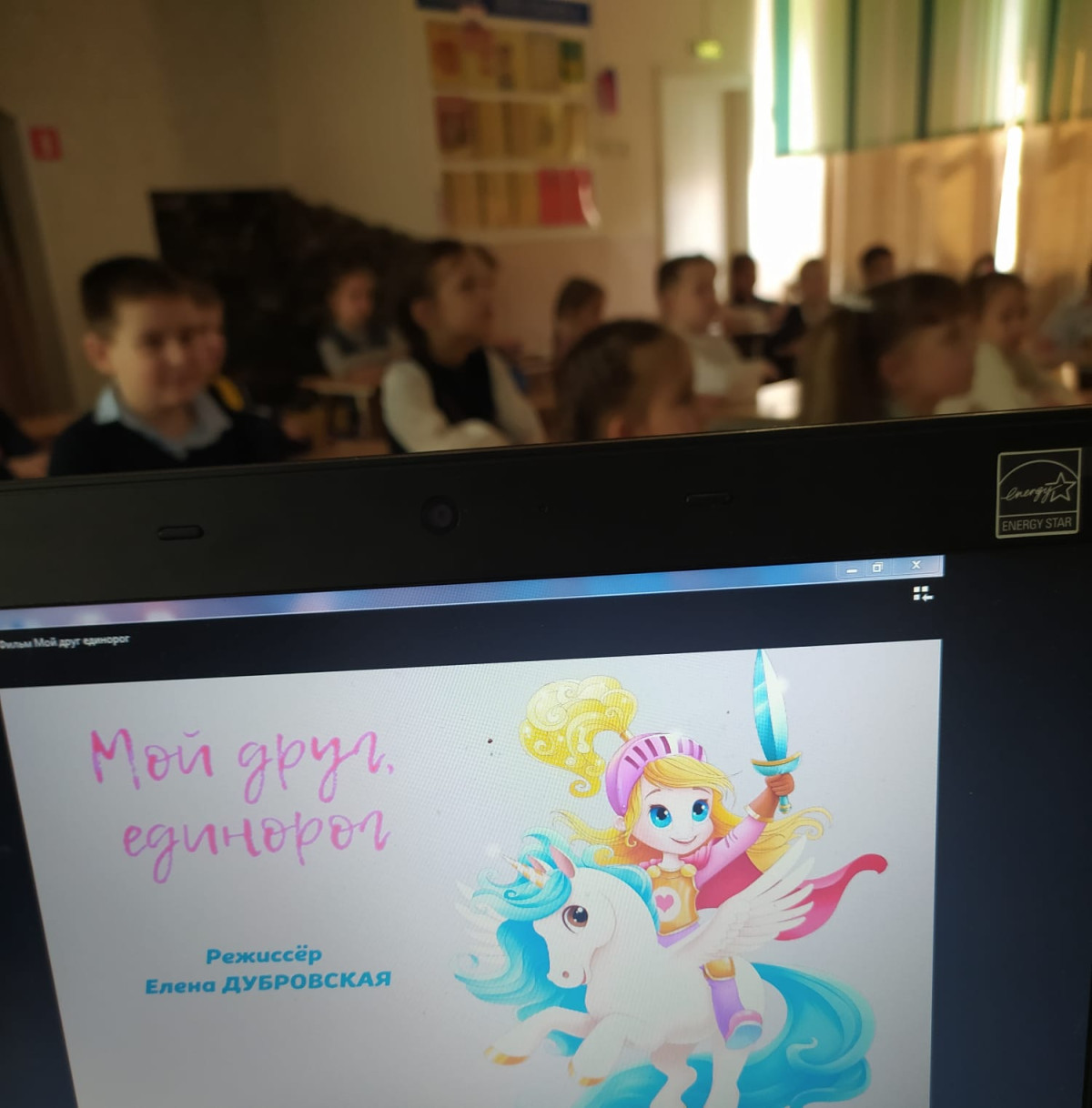 В рамках Всероссийского проекта "Киноуроки в школах России" в 1 "Б" классе МБОУ ЦО «Интеллект» 05.03.2025г. был организован просмотр фильма "Мой друг Единорог", который затрагивает тему фантазии и воображения.