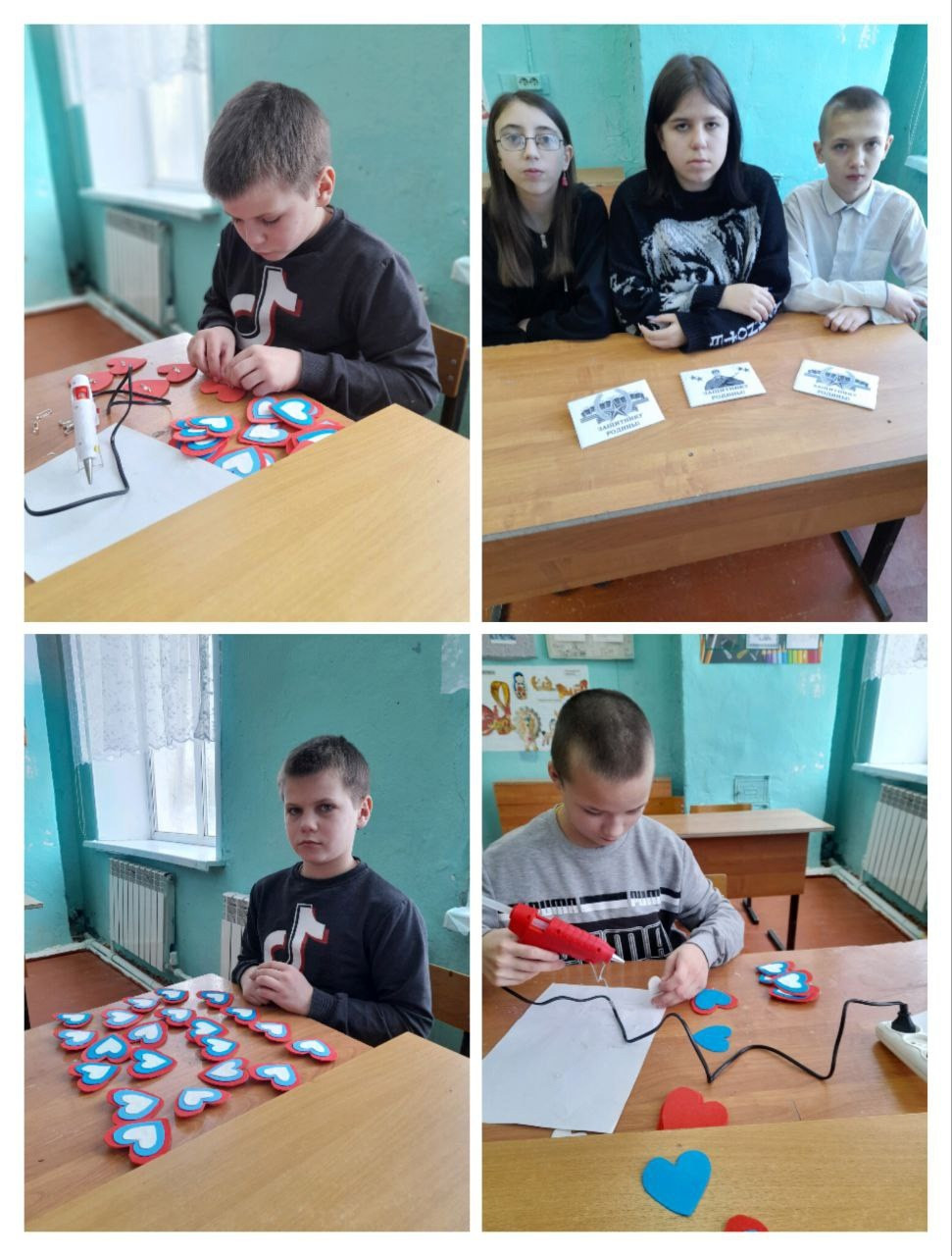 Ребята дружно взялись за работу, кто- то вырезал сердечки, кто -то клеил, В итоге было сделано более 70 штук значков. Мы надеемся , что наши значки –сердечки защитят воинов в трудную минуту и станут для них оберегом.