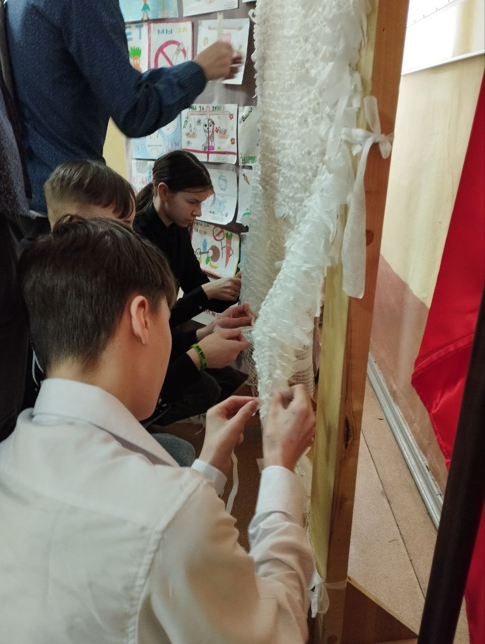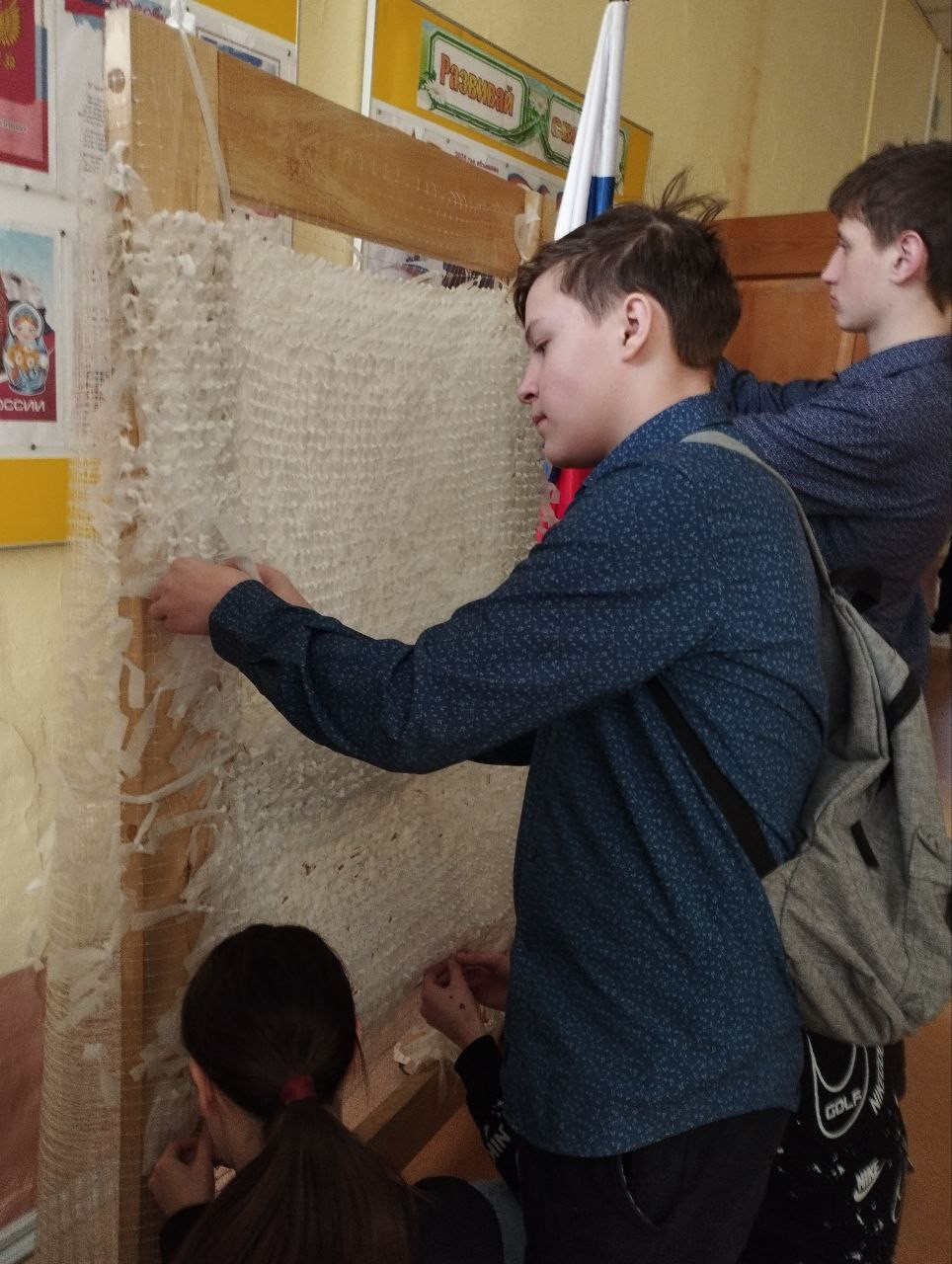 В рамках системы воспитания "Киноуроки в школах России" у восьмиклассников снова выдался классный час на кино. На этот раз "Счастливые люди". Сложный вопрос - счастье. Всем хочется счастья для себя. А в фильме главные герои сами себя назвали счастливыми, отказались от удачного предложения (поездки на конкурс в Санкт-Петербург) для себя и решили поделиться своим счастьем с другими. Потому, после просмотра делились рассуждениями: Чем можем мы, восьмиклассники, сделать чуть-чуть счастливее других людей? Это, несомненно, относится к тем, кто делает мирным наше небо над головой. Ребятам была подсказана инициатива проявить заботу и вложить частичку своего труда в плетение сети для оборонительных сооружений военным, находящимся на СВО. Плетение сети явилось нашим маленьким вкладом в ОБЩЕЕ дело - заботу о защитниках нашего Отечества.